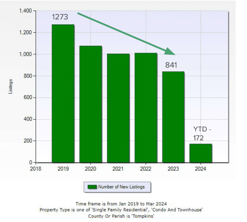 In 2023, there were 841 properties made available to purchase in Tompkins County, compared to 1,273 prior to the pandemic.