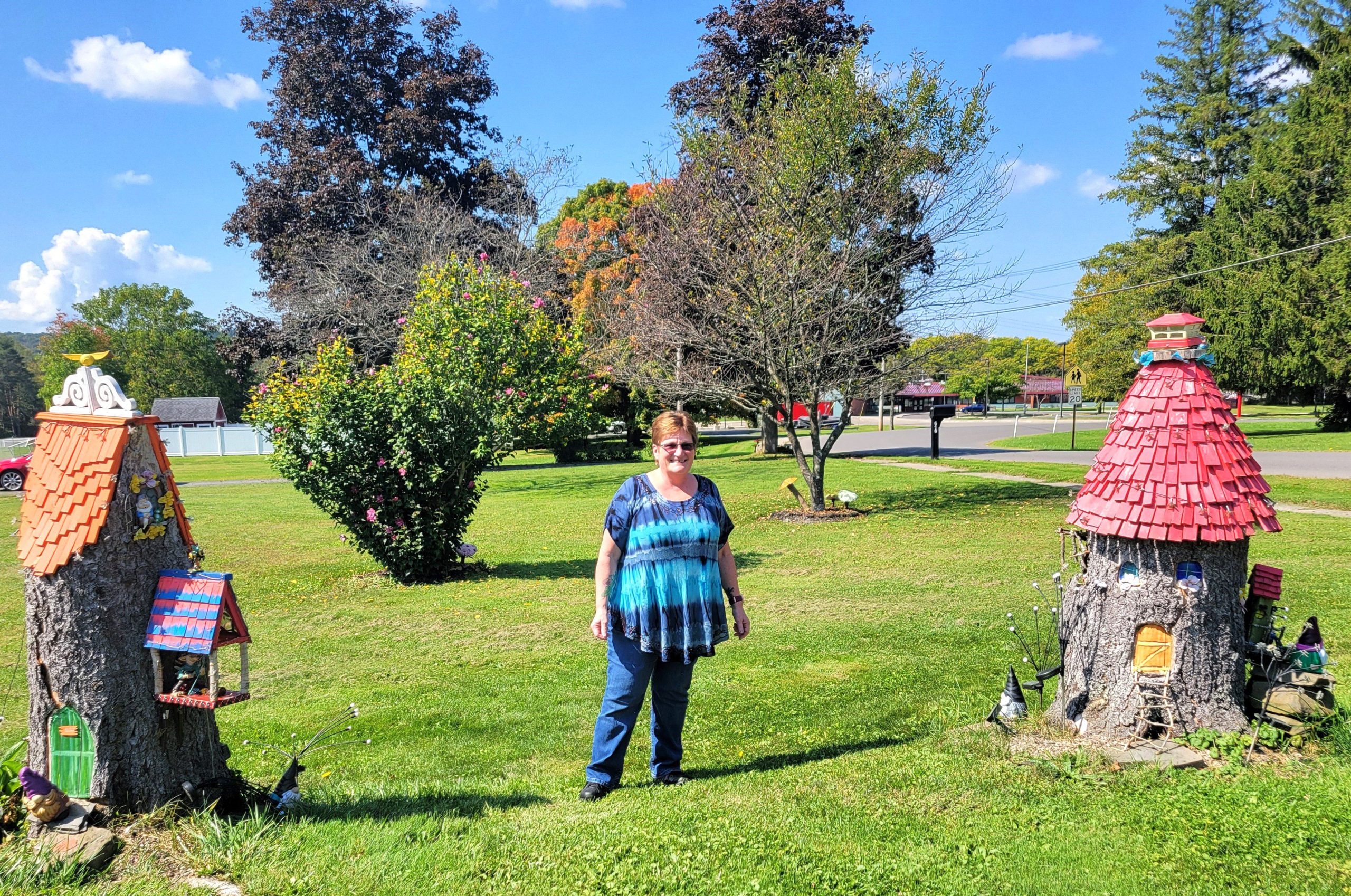 Pam’s sister, Cindy, still lived in their childhood home in Newark Valley. She looked out her window at a 12-foot-tall tree stump belonging to a neighbor on Silk Street. Cindy took a photo, sent it to Pam, and told her she should turn it into a fairy house, which Pam did, and it is still there today.