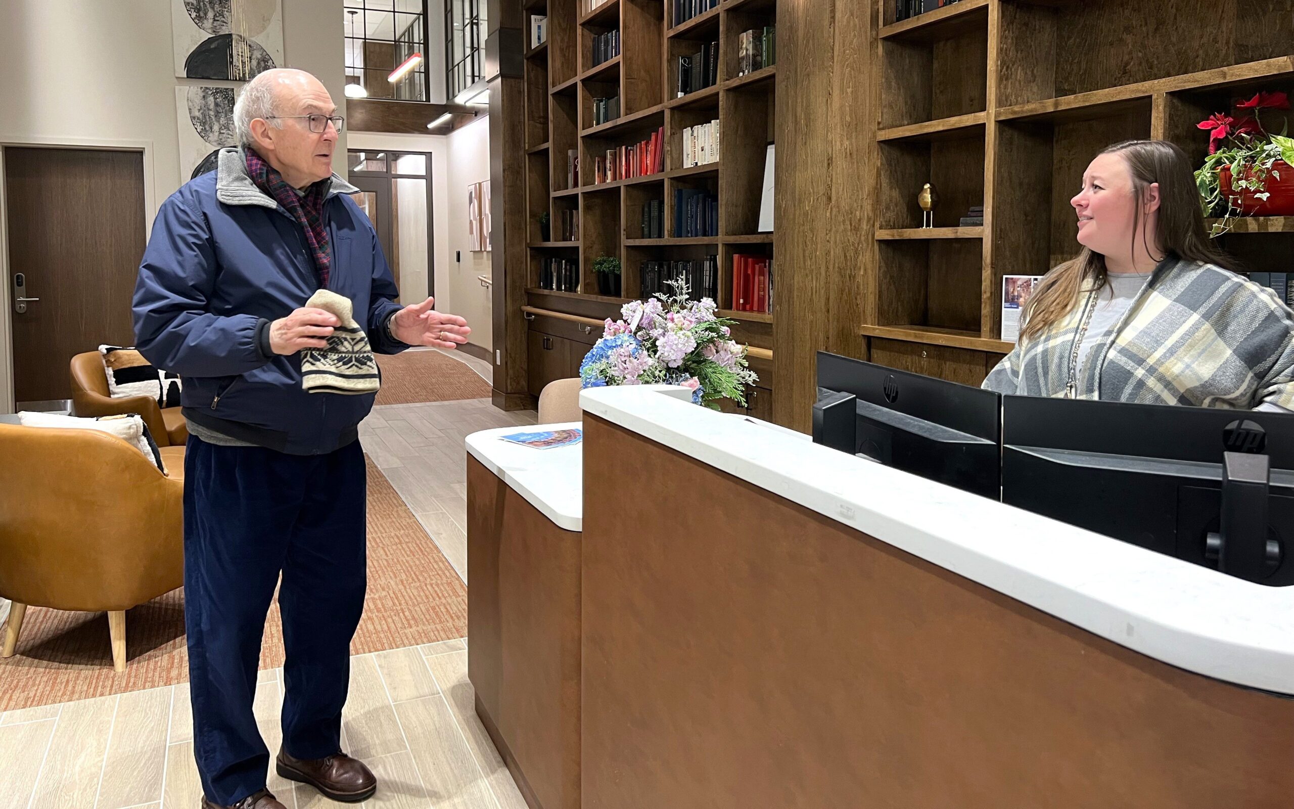 Bill Highland, resident of Library Place in Ithaca, speaks with Kelsey Reed, Library Place asset manager, about how much he appreciates the huge selection of books gracing the many shelves of the building’s lobby. Photo by Jaime Cone Hughes