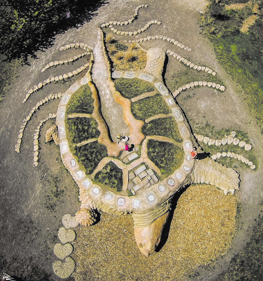 Gaia is the brainchild of an innovative team including the three founders of the garden and artists Robert “Bo” Atkinson and Victoria “Victrola” Romanoff. The founders wanted a structure that would stand out and reflect the story of the Native American land on which the garden was built. Atkinson was the sculptor, Romanoff was the designer, and together, they helped turn an original sketch of a flat turtle into a 3-D, realistic structure.