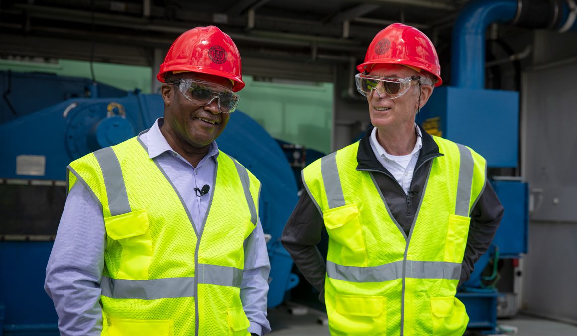 In this photo: Lynden Archer, Cornell’s dean of engineering (left), talks with Nye at the drilling site for the project.