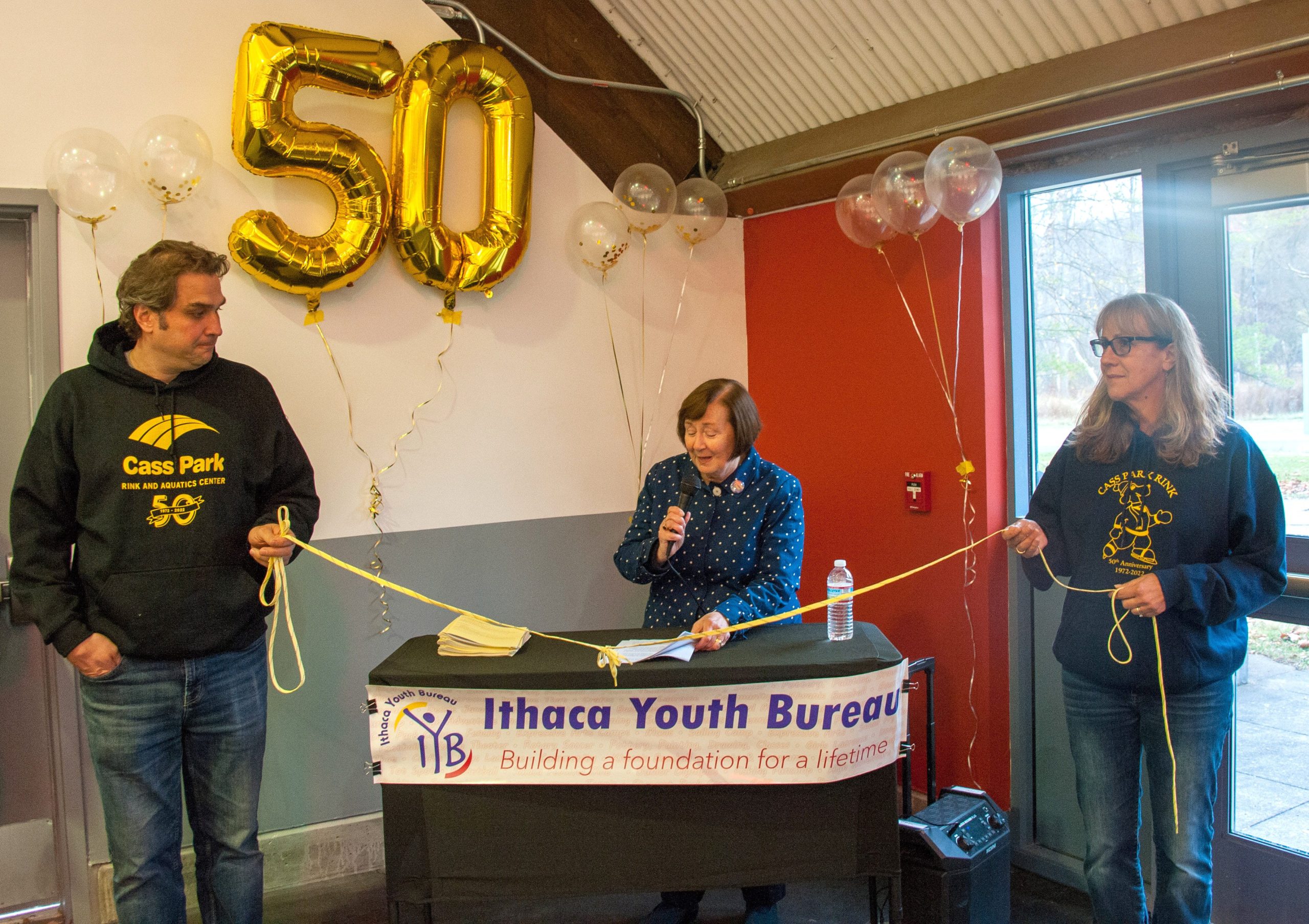 Former New York State Assemblymember Barbara Lifton was invited to ceremonially untie an ice skate lace (instead of cutting a ribbon) because state resources were very important to fund the $2.6 million project. Current Assemblymember Anna Kelles read a citation recognizing the 50th anniversary milestone.