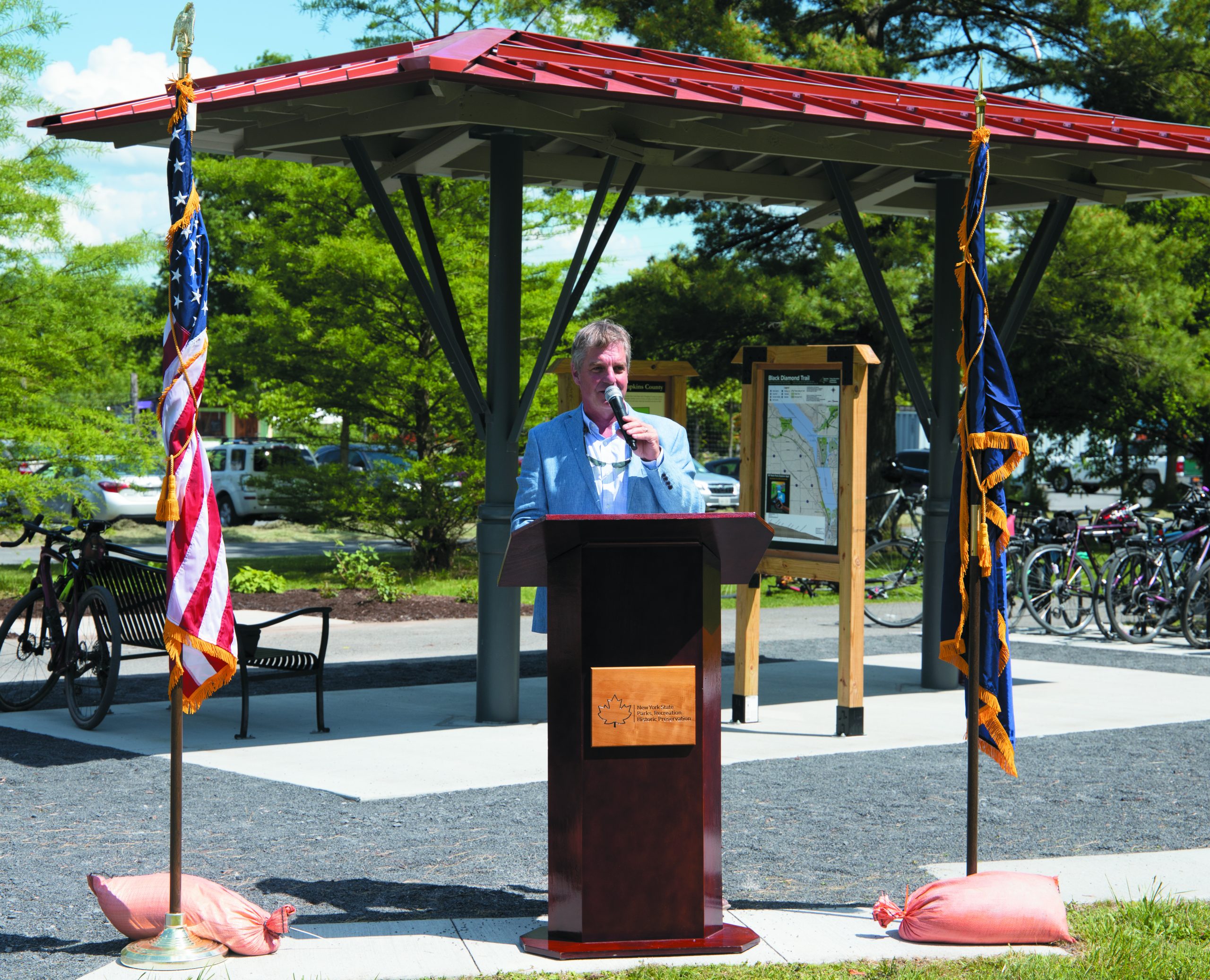 The New York State Office of Parks, Recreation and Historic Preservation’s Finger Lakes Regional Headquarters held a ribbon cutting event for the recently installed kiosk for the Black Diamond Trail Trailhead in Cass Park.