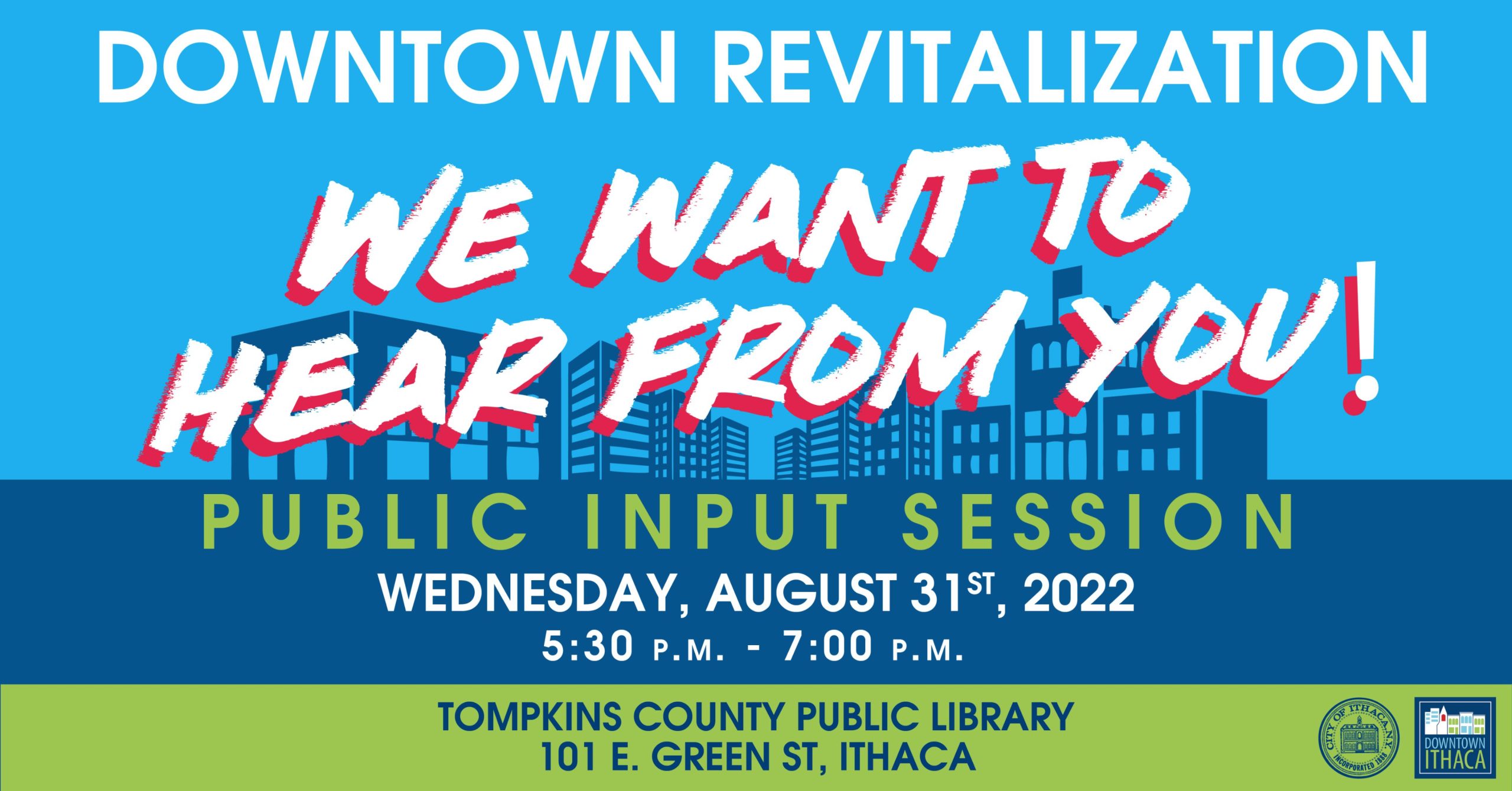 The Downtown Ithaca Alliance (DIA), in partnership with the city of Ithaca and Unbroken Promise Initiative, invites residents to join them at a community input session where they want to hear about the priorities and interests of the broader community pertaining to downtown revitalization.