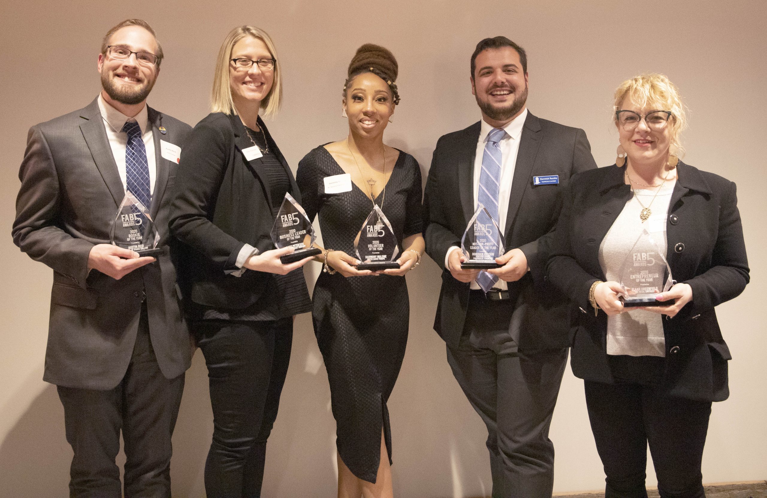 Tompkins Connect has announced it will extend the deadline for nominations for the seventh annual Fab5 Young Professional Awards to Dec. 14. The Fab5 Awards, which are sponsored by Tompkins Trust Company, celebrate the achievement of young professionals ages 21 to 40 in Tompkins County. This year, the Fab5 Committee is seeking young professionals who have been able to shine and excel despite the unprecedented challenges our community has faced over the last year and a half. This year’s theme is “5-Star Reviews” and encourages people to nominate young professionals in the community for whom they would give a glowing five-star review. The Fab5 Award categories are: Entrepreneur of the Year, Not-for-Profit Leader of the Year, Business Leader of the Year, Volunteer of the Year and Rookie of the Year. Katie Shaw, Tompkins Connect chair, shared, “We have received many quality nominations so far and decided to extend the deadline to give our community the opportunity to nominate additional young professionals who are excelling in their fields. We appreciate everyone who has already taken the time to nominate someone for a Fab5 Award and encourage others to do so. It only takes a couple of minutes and is an awesome way to recognize someone for their contributions to our community as well as providing great exposure for businesses and organizations.” To nominate an individual, visit tompkinsconnect.org/fab5. Nominations are due by Dec. 14, and the winners will be announced in early February. The Fab5 Committee hopes to return to an in-person event, scheduled for March 7 at Coltivare. The event’s media sponsor is the Ithaca Voice. In this photo: Fab5 2019 winners (from left to right) Austin Reid (Rookie of the Year), Abby Peterson (Business Leader of the Year), Harmony Malone (Volunteer of the Year), Dominick Recckio (Nonprofit Leader of the Year) and Elaan Greenfield (Entrepreneur of the Year) celebrate their win at the annual Fab5 awards ceremony, held at Coltivare on March 2.
