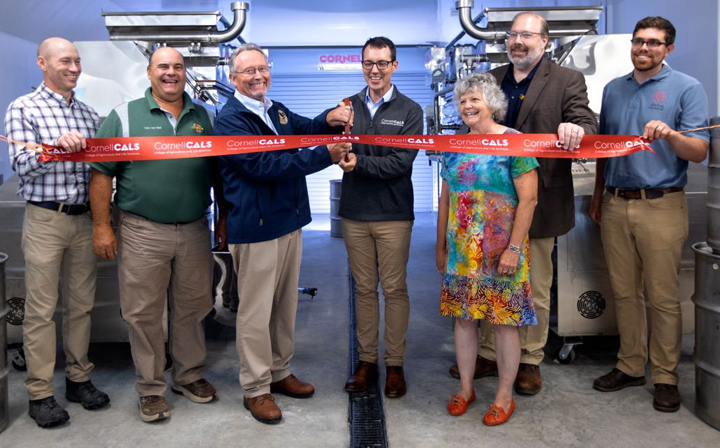 The Cornell Maple Program has opened an advanced, New York state-funded maple research laboratory, an upgrade that will enable research on how to produce the highest-quality syrup, develop new maple products and improve existing ones — all at commercial scales. The research, educational materials and expertise that the facility will generate will inform New York state maple producers and help ensure that the industry continues to grow. The U.S. Department of Agriculture valued the state’s 2020 syrup sales at $30 million. On July 29, a ribbon-cutting ceremony commemorated the opening of the new facility at the Arnot Teaching and Research Forest in Van Etten, New York. “This state-of-the-art facility positions New York’s already thriving maple industry for new successes and that’s a win for maple researchers, producers and consumers alike,” said Benjamin Houlton, the Ronald P. Lynch dean of the College of Agriculture and Life Sciences. Houlton attended the ceremony along with Richard Ball, commissioner at NYS Department of Agriculture and Markets, and Lupardo, New York State Assembly member (D-123rd Dist.). Pictured (from left to right): Aaron Wightman, Cornell Maple Program co-director; Tony van Glad, NY Maple Producers Association board president; Ball; Houlton; Helen Thomas, NY Maple Producers Association executive director; Kevin King, NY Department of Agriculture and Markets deputy commissioner; and Adam Wild, Henry Uihlien II and Mildred A. Uihlein director of the Uihlein Maple Research Forest.