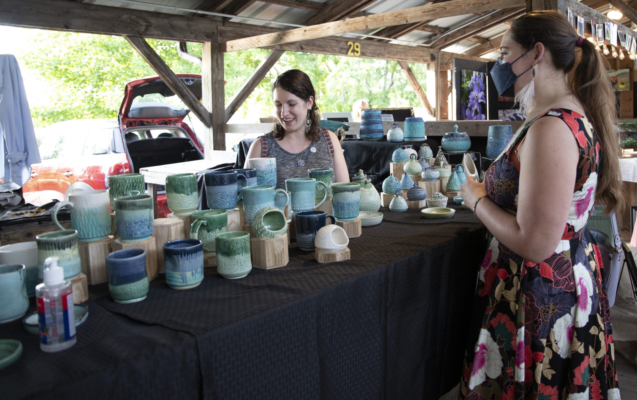 On Aug. 13, from noon to 7:30 p.m., the annual Ithaca Artist Market, a program of the Community Arts Partnership and the Ithaca Farmers Market, filled all 88 booths at the Farmers Market with a juried show and sale of work by local and regional fine and functional artists (and two authors). Over 75 artists sold paintings, prints, sculpture, collage, photographs, jewelry, fine furniture, paper cuttings, ceramics, fiber art, altered books, shadow boxes, woodcarvings, letterpress, blown glass and more. Visitors also had the unique opportunity to meet and talk with all of the artists in one place. In addition to the artists, local organizations showcased their missions and upcoming events, performing arts organizations and artists performed on the hour, Discover Cayuga Lake ran boat tours at the dock, and there were plenty of food, wine and beer vendors. The East Hill Jazz Group played throughout the day. “We are so happy to be able to see a return of the Artist Market [after having to cancel 2020’s event due to the pandemic]. The artists are so excited to be able to come together once again to show visitors what they’ve been working on this past year,” said Robin Schwartz, program and grant director of the Community Arts Partnership. “I am constantly blown away by the quality and variety of work by the exceptionally talented artists in our area.” The Market is held rain or shine. Find the Farmers Market off Route 13 at Third Street (turn at the corner of Aldi and B&W Supply). If using GPS, it is 545 Third St., Ithaca, NY 14850. Visit the Community Arts Partnership’s website at ArtsPartner.org for more information. In this photo: Angela Niforatos (left) talks with a customer at her booth, Achille’s Wheel Studio, at the Ithaca Artist Market.