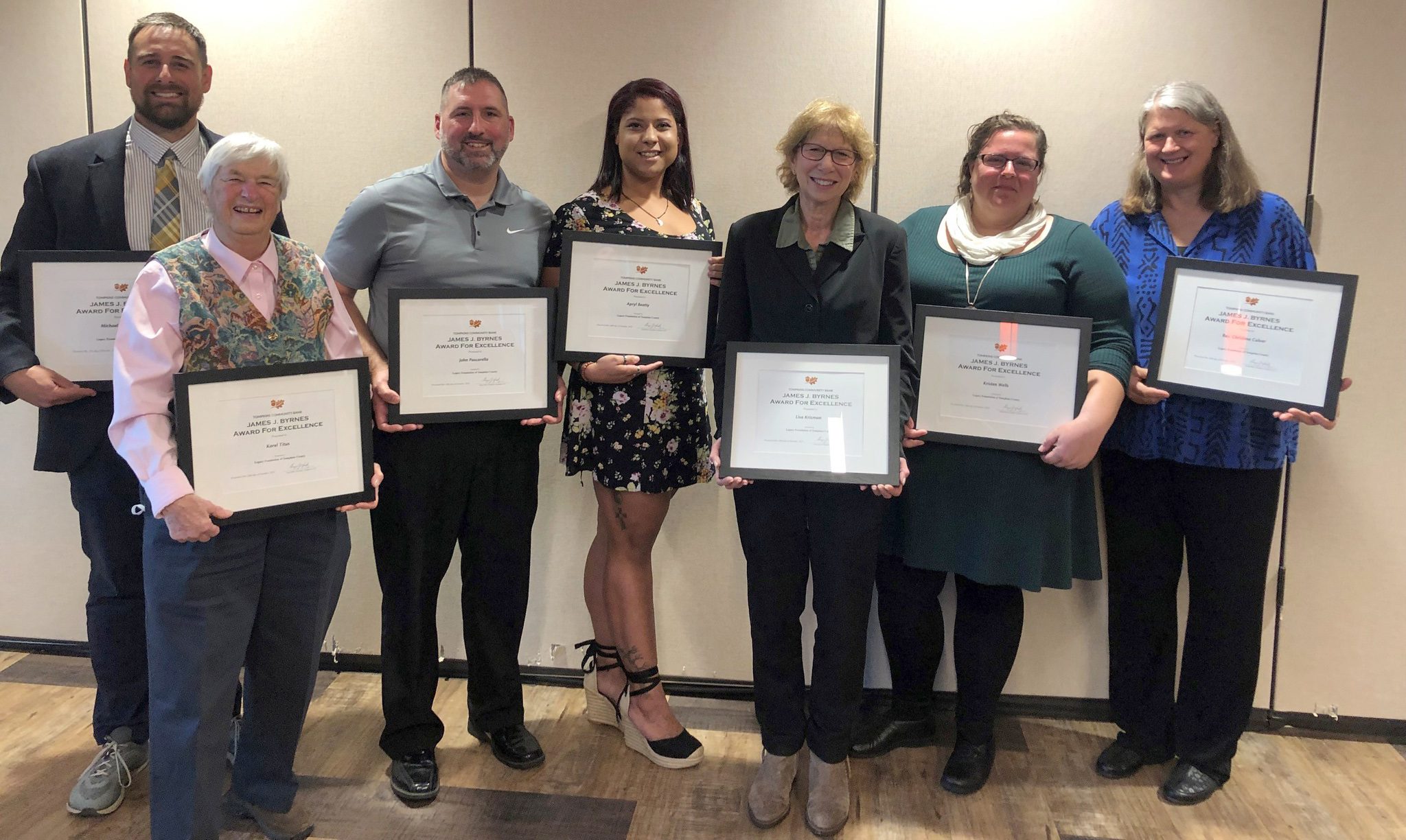 2022 James J. Byrnes Awards for Excellence recipients included (pictured, from left to right) Michael Perehinec of Special Olympics New York, Karel Titus for her lifelong volunteerism primarily in Seneca County, John Pascarella for his work in youth sports in Dryden, Apryl Beatty of Cortland Community Matters, Lisa Krizman of Stablework, Kristen Wells (and volunteers) from Gadabout, Rev. Christina Culver (and volunteers) from Loaves and Fishes of Tompkins County, and (not pictured) Topher Scott for his efforts to found and organize the Racker Rivals Big Red fundraiser.
