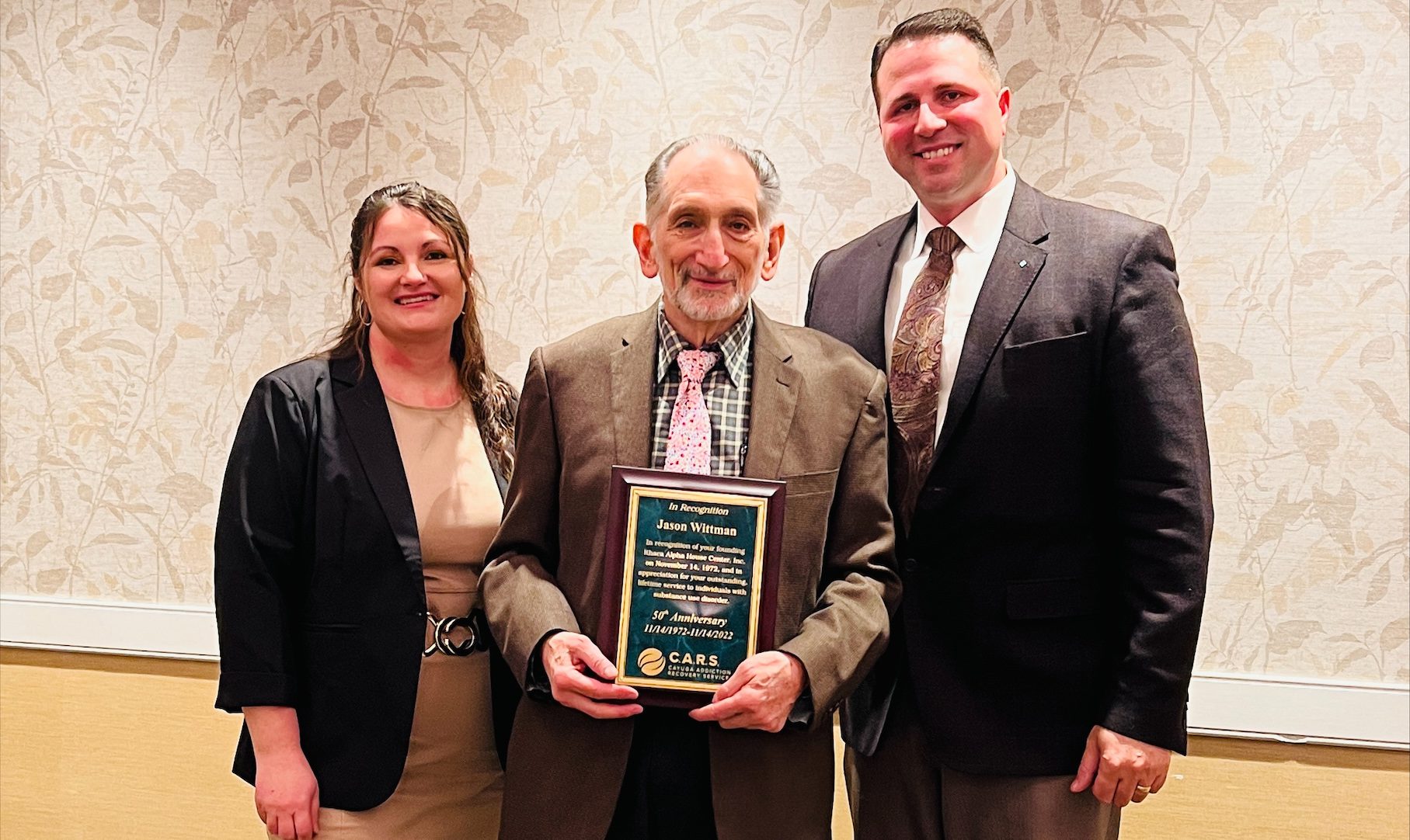 Cayuga Addiction Recovery Services (CARS), Cayuga Health leadership and staff supporters gathered for CARS’ 50th Anniversary Celebration at Hotel Ithaca on Nov. 16. During the event, Jason Wittman (center), M.P.S., the founder of CARS, was recognized for his achievement during his many years of providing care for youth and adults struggling with addiction.