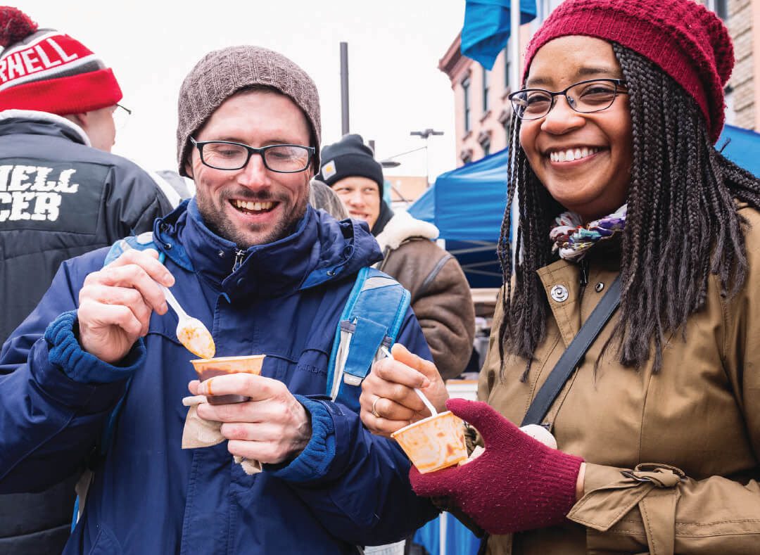 Get your palates ready for downtown Ithaca’s 24th Annual Chili Cook-Off happening in March. Downtown Ithaca typically hosts this crowd-drawing cook-off in early February; however, due to the omicron variant sweeping through the community, the event is moving to one month later, March 5, to keep everyone safe. “Dozens of restaurants and eateries participate and thousands of people show up for our Chili Cook-Off each year, and we want everyone to have the safest experience possible. To that end, we’ve worked with the Tompkins County Health Department to determine an ideal time to host this event, and early March seems to be a good fit,” said Scott Rougeau, special events director for the Downtown Ithaca Alliance (DIA). New this year, guests will have a couple of opportunities to enjoy chilis. During the week leading up to the big event, folks will be able to enjoy bowlfuls of steaming sweet, spicy, tangy, meaty, vegan and vegetarian chilis and chili-inspired items at participating restaurants. Guests can then come downtown on March 5 for even more chili options at the cook-off competition. Each of the chilies in the competition is freshly prepared by some of the region’s best chefs from over two dozen participating restaurants and eateries. Locally and regionally produced brews, wines and ciders tastings will also be part of the event. The DIA is currently recruiting restaurants, and some of the confirmed participants include Antlers Restaurant, a newcomer to the cook-off, Kilpatrick’s Publick House, Mahogany Grill, Lucky Hare Brewing Company and The Hotel Ithaca. Culinary experts from these and other participating restaurants and eateries will be competing for the public’s votes to earn People’s Choice and Best Presentation honors. You’ll be able to vote for your favorites at the event. Meanwhile, a juried group will decide the top three entries for Best Meat Chili, Best Vegetarian Chili and Best Local Beverage. The grand prize is the famed Chili Cook-Off trophy and plenty of bragging rights! If you’re a restaurant or eatery interested in participating in this event, you can complete the Chili Cook-Off registration form on downtownithaca.com. For additional Chili Cook-Off information and to purchase tickets, visit downtownithaca.com. Shown above: two patrons enjoy chili at a past year’s Chili Cook-Off.