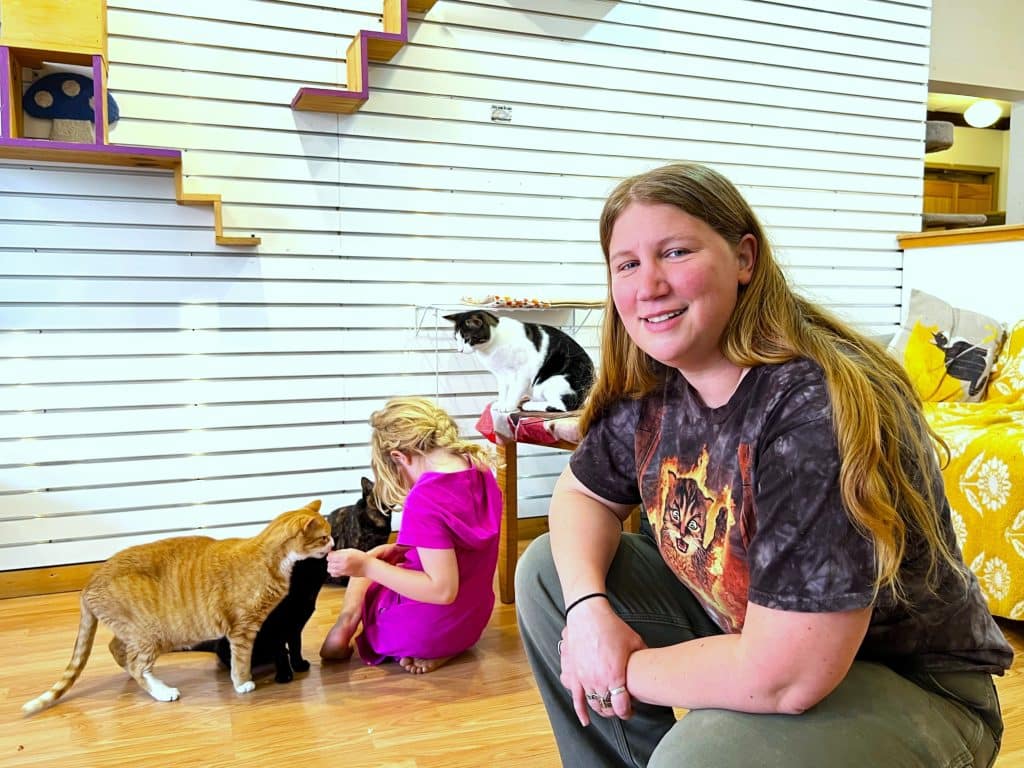 “I’m very lucky that my kiddo can come to work with me, whether she wants to or not,” she said with a laugh, adding that usually Mackenzie enjoys the cat café environment and that she feels fortunate her business tends to attract customers and employees who are positive and welcoming of children.