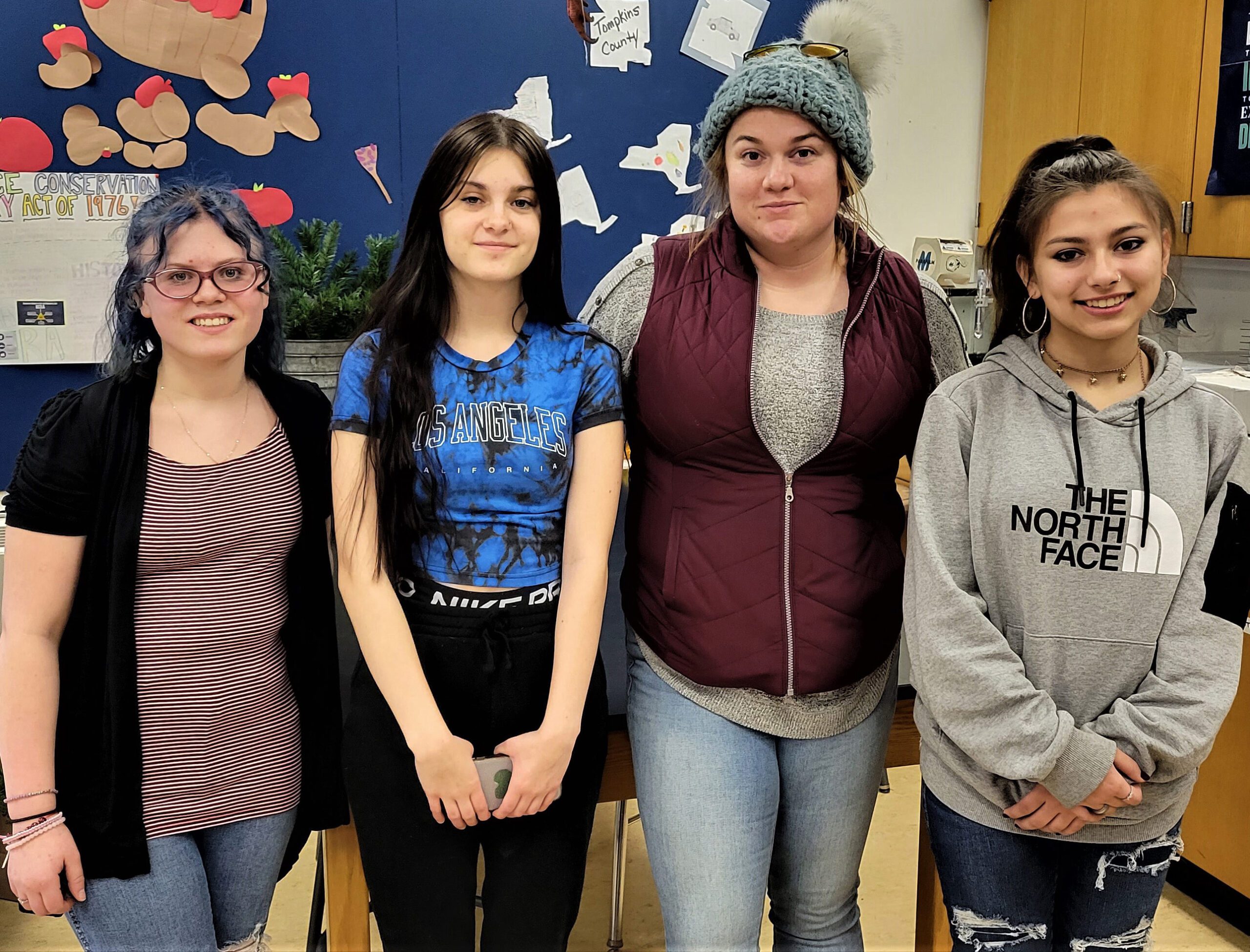 : Chelsey Mahany, Groton Jr./Sr. High School’s agriculture teacher and Future Farmers of America (FFA) advisor in her classroom with some of her ag students. Left to right: Courtney Felko (grade 11), Savanna Dixson (grade 11), Chelsey Mahany, Erica Miranda (grade 8). Photo by Linda M. Competillo