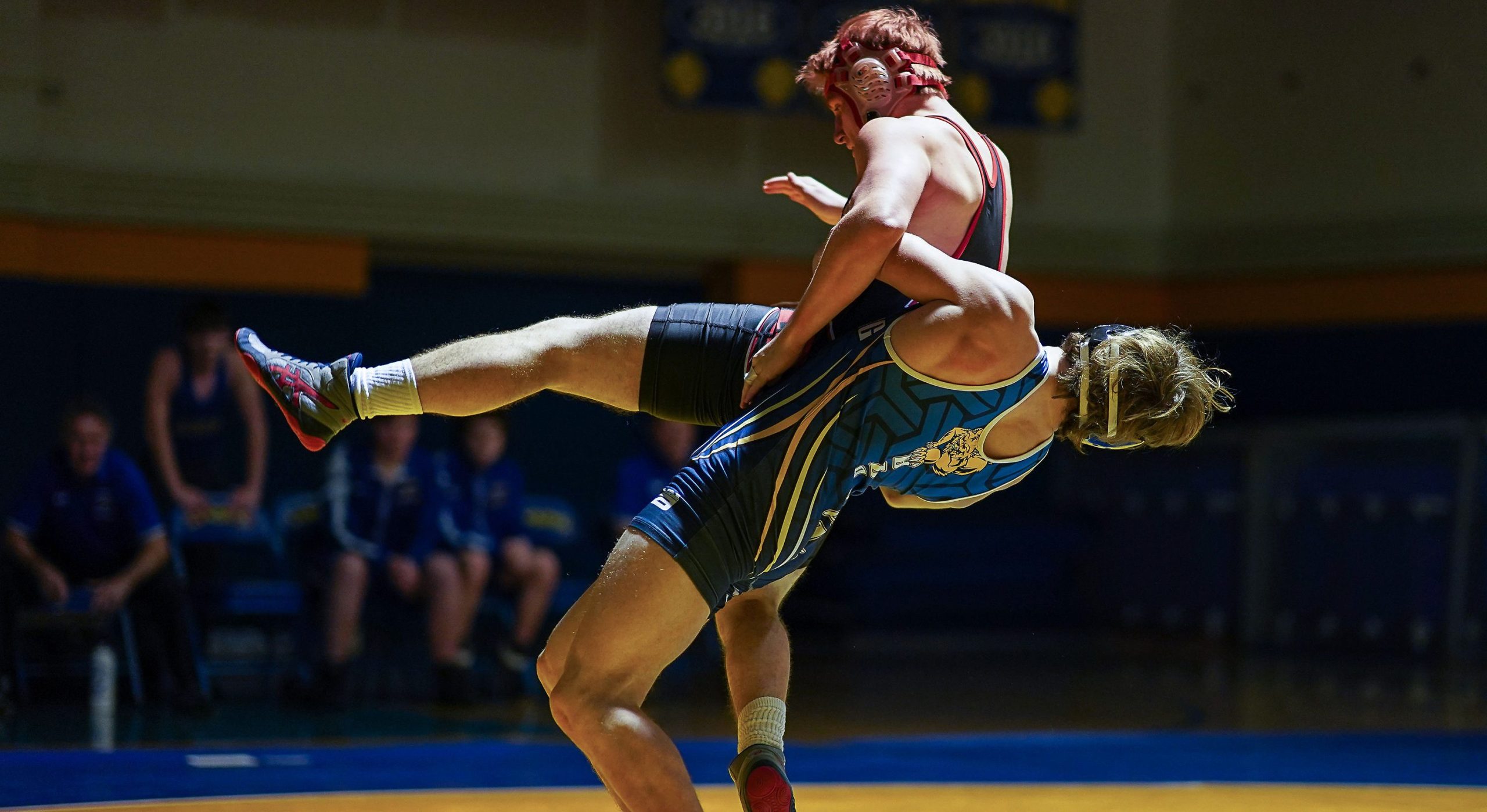 Lansing’s Gabe Stevens lands a throw on Groton’s Anthony Rotunda during a match in January 2020. Wrestling is one of several high-risk sports set to return in Tompkins County this month. Photo by Old Stage Photo.