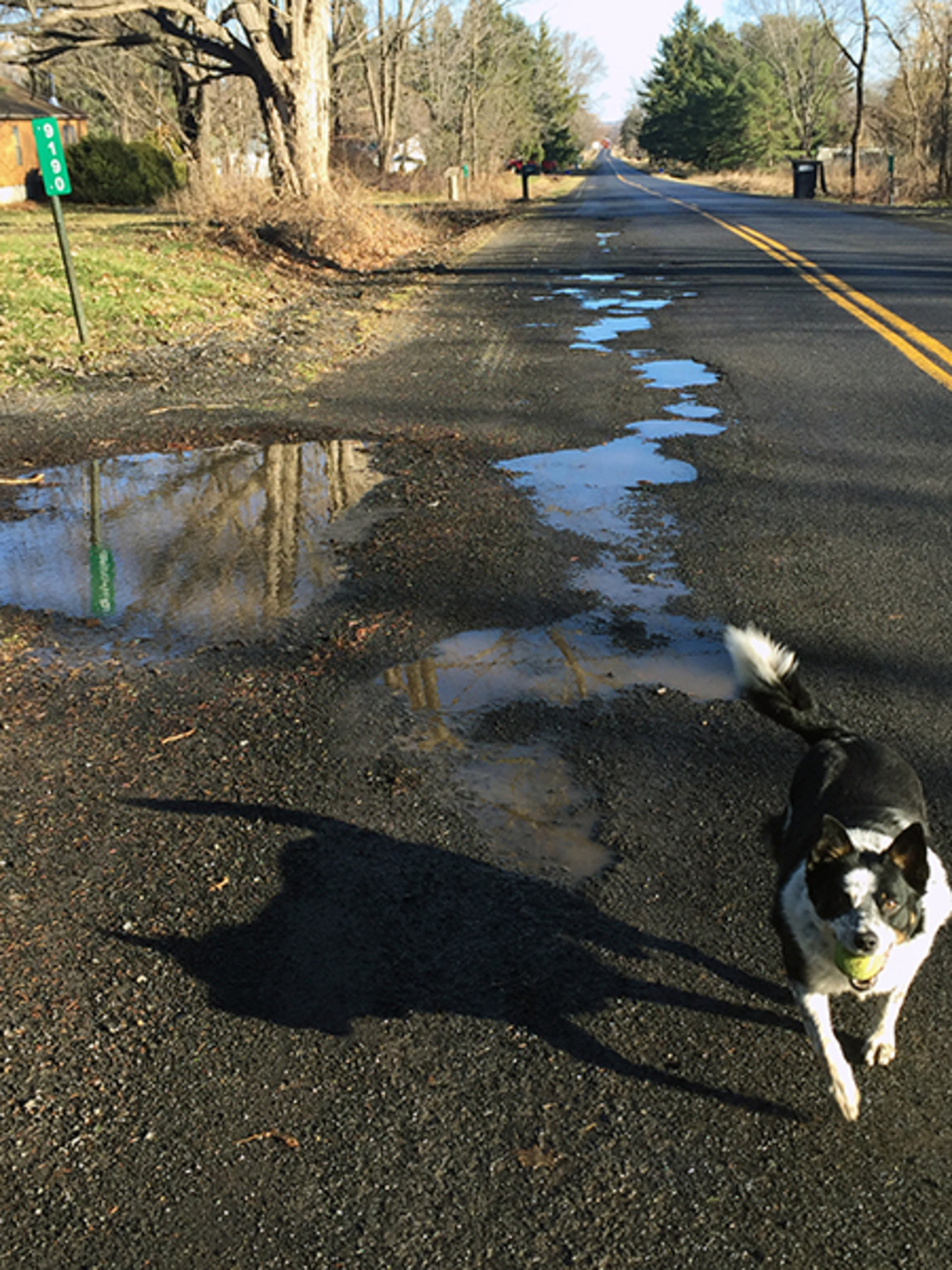 The first ball I threw went right down the center of the road; she caught it off the bounce. On my second throw, tragedy struck. She hit the ball with the end of her nose and it bounced down, into the ditch, into the frothy quick water.