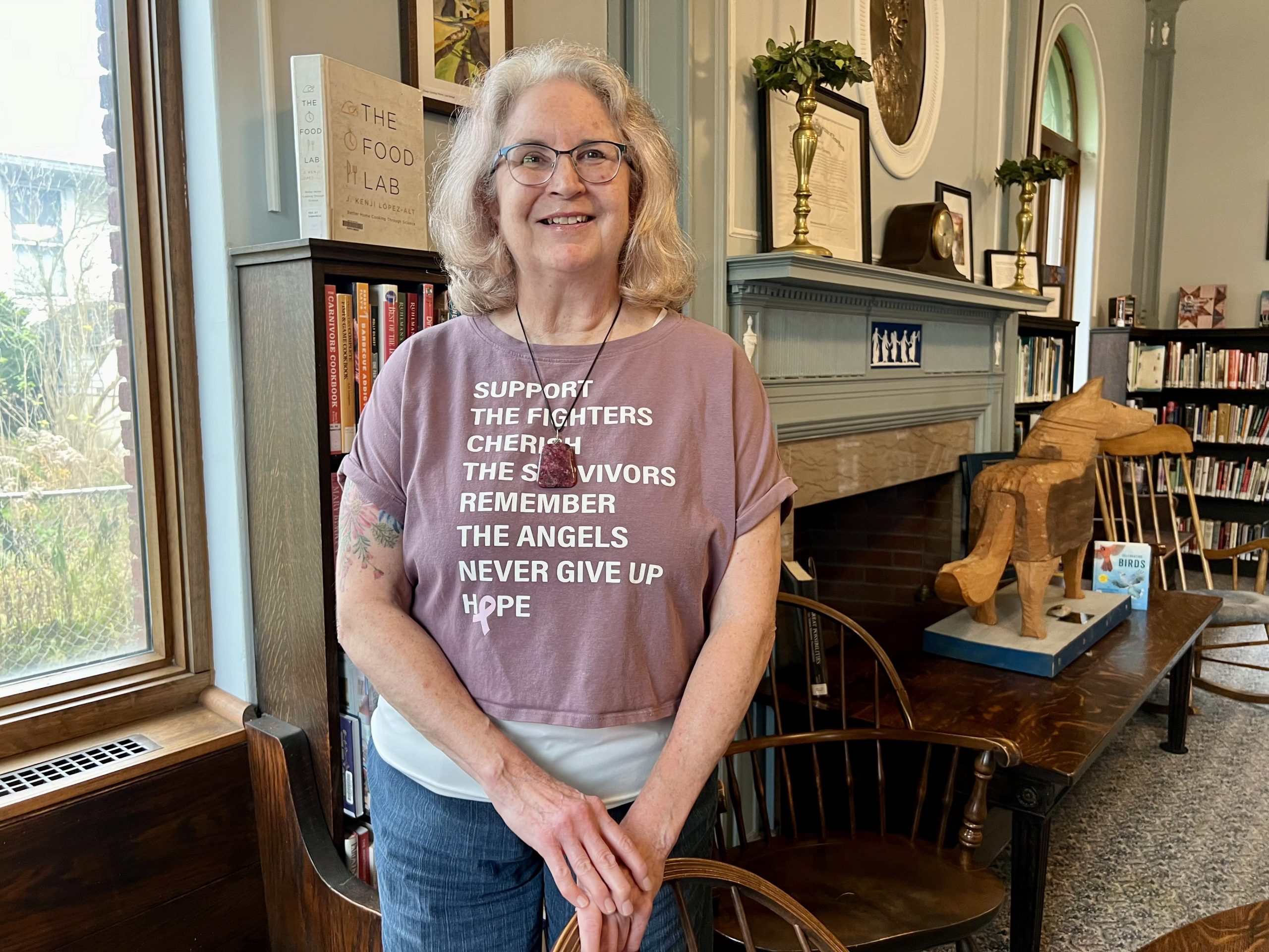 Sara Knobel, Groton Public Library director, in the main room of the library on a recent weekday afternoon. For the past 15 years, Knobel has worked to make the library an official food bank, as well as a community hub that is safe space for everybody. Photo by Jaime Cone Hughes