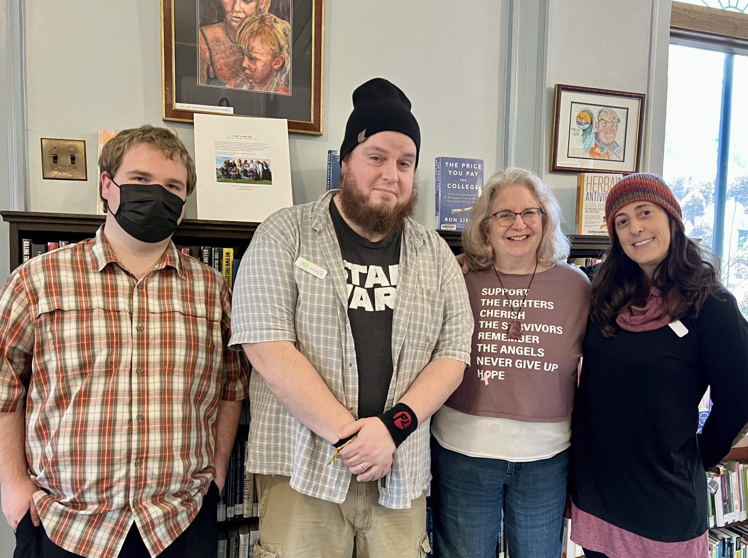 The staff at the Groton Public Library gather together on a recent day at the library. From left to right: Ryan Black, senior library clerk, Justin Wilcox, library clerk, Sara Knobel, library director, and Elizabeth Honis, library assistant. Photo by Jaime Cone Hughes