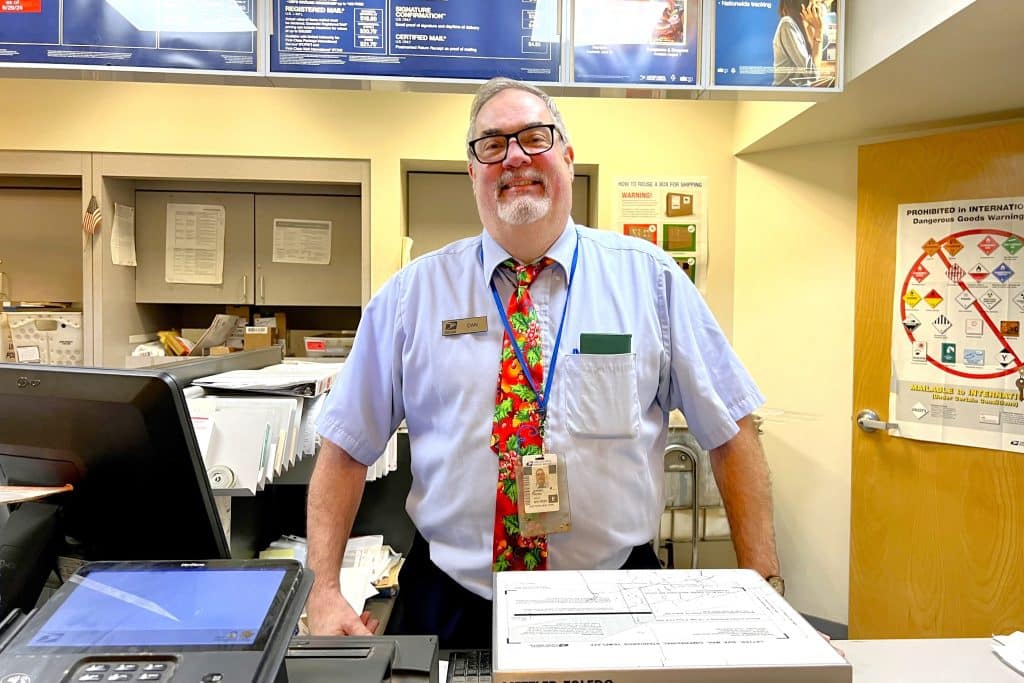 Daniel Horn stands at the front desk of the United States Postal Service office, where he has worked for 22 years. Photo by Jaime Cone Hughes