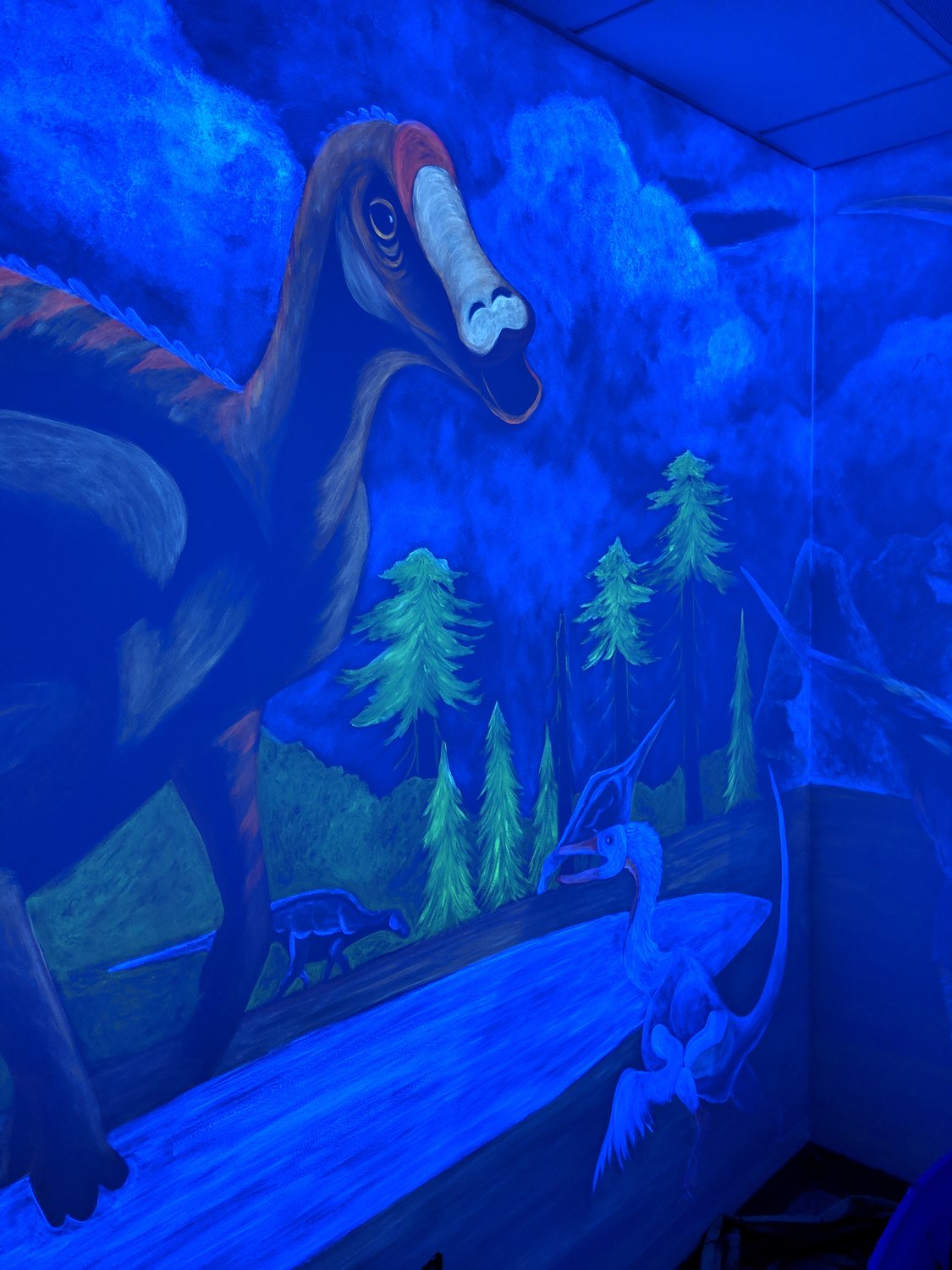 Ihnken already had a connection to PRI before starting the blacklight mural. Her work can be found on the walls of the Institute. So, when it came to painting dinosaurs she knew just who to consult with.