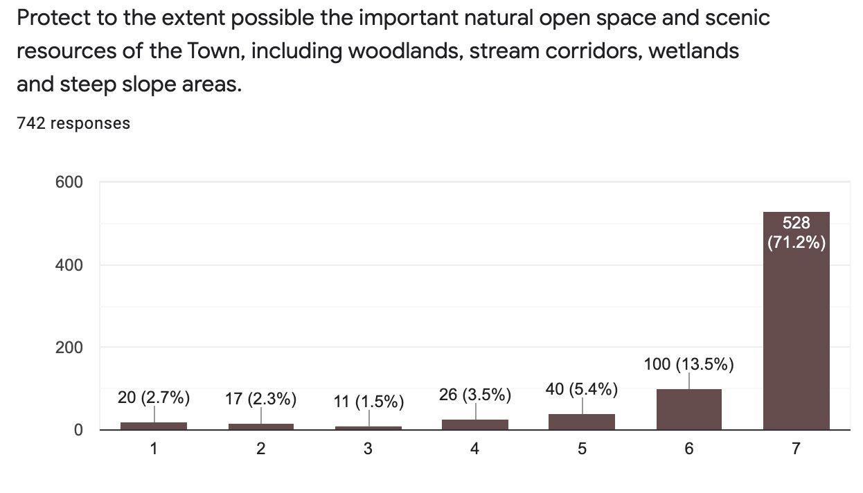 Related to agriculture, the survey showed that while residents want to ensure the long-term viability of agriculture within the town, they don’t see agriculture and farmland as part of the conservation of open space and conservation.
