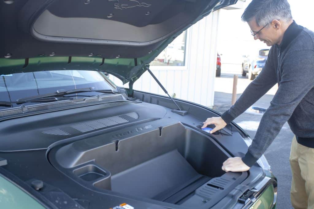 Jesse Dovi inspects under the hood of a Ford Mustang Mach-e Premium AWD, the look is starkly different from traditional gasoline fueled vehicles. Currently driving an F-150 Hybrid, he’s previously owned Mustang Mach-es and an F-150 Lightning.