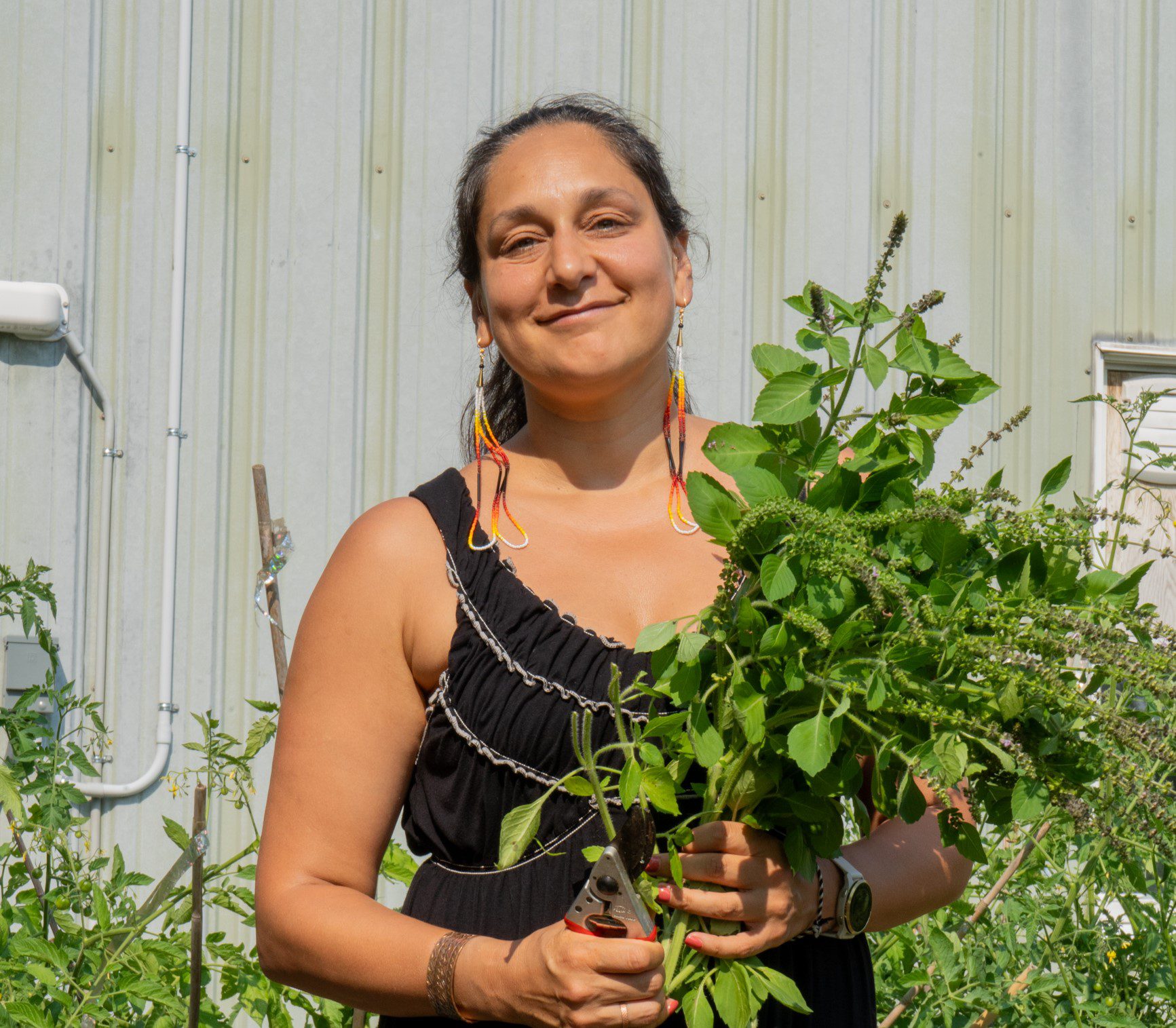 Collaboration with The Soil Factory has provided OJI:SDA’ with a more public space; they also care for beautiful land in Spencer. “Today we are harvesting tulsi which is a beautiful, fragrant plant and an adaptogen which helps with our elasticity,” said Moss. “We all sat around taking the leaves off the tulsi to dry them. These are then packed up as part of the blend that goes out to the Indigenous circles that we support. We also have some community volunteer days at the Spencer farm because it’s special to be out there.”