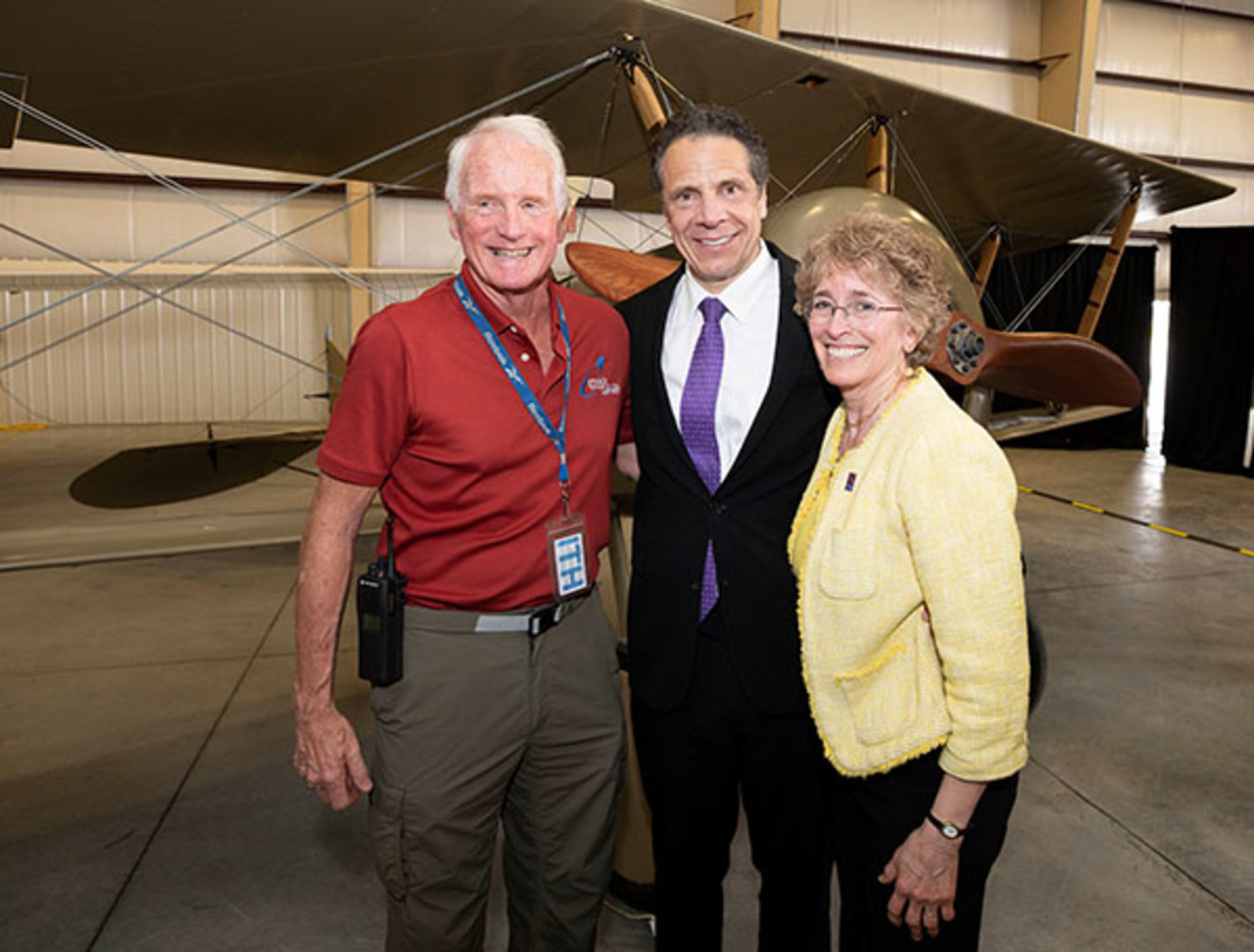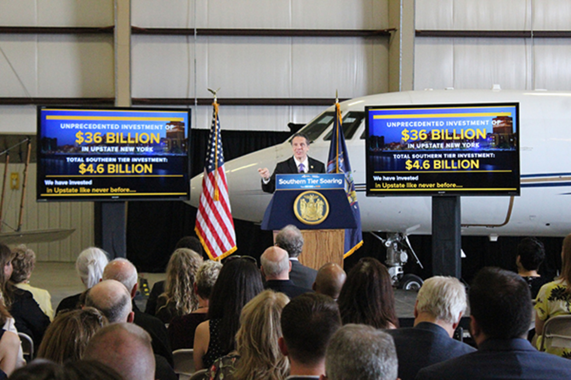 While standing in front of the new Governor’s plane at the Ithaca Tompkins Regional Airport on Thursday, May 3, Governor Andrew Cuomo announced to the gathered crowd of Tompkins County professionals and local elected officials that the state had awarded $14.2 million to the airport for major renovations and additions as part of the Upstate Airport Economic Development and Revitalization Competition. In total, the project will cost around $22 million to be funded from additional grants, and private funding.