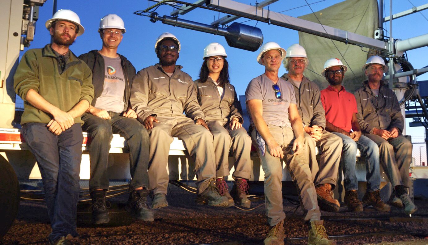 Dimensional Energy staff members (from left to right) Aaron Breetwor, Brad Brennan, Bolaji Alonge, Adrienne Lee, CEO and founder Jason Salfi, Brian Bowman, Mihir Gada and Huck Milton at the Integrated Test Center in Gillette, Wyoming, late last year. Photo by Aaron Breetwor/Dimensional Energy.