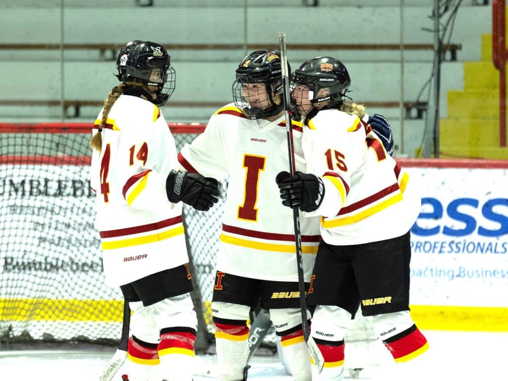 Ithaca’s Sonia Enns, Adele Wrisley, and Jordan Sheehan (left to right) celebrate a goal during a December 21 game against Oswego at Lynah Rink. The Little Red are in the midst of preparing for their sub-regional matchup against the Section III champion on Feb. 17.