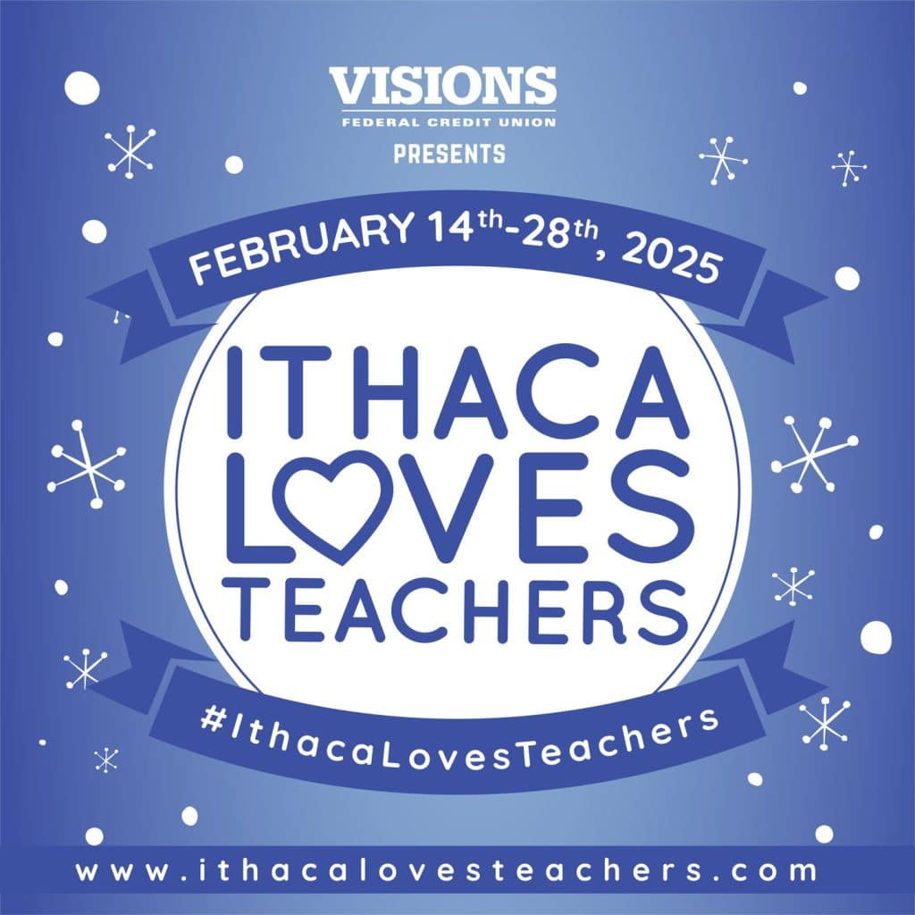 Visit Ithaca, Tompkins County’s contracted destination management organization, organizes and produces Ithaca Loves Teachers in partnership with Tompkins Chamber and Downtown Ithaca Alliance. The presenting sponsor is Visions Federal Credit Union.