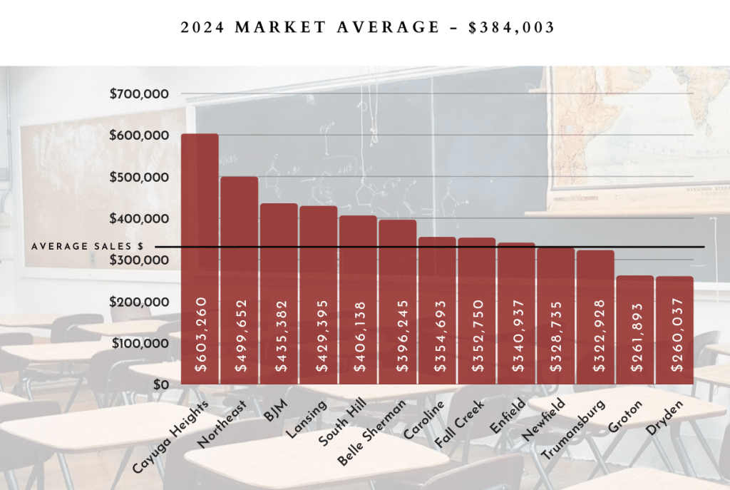 Average residential sales prices have increased across all school districts, with the most expensive being the Cayuga Heights district, which had an average sale price of $603,260 in 2024. The Dryden Central School District had the lowest 2024 market average at $260,037, according to information gathered by Warren Real Estate from a variety of multiple listing services.