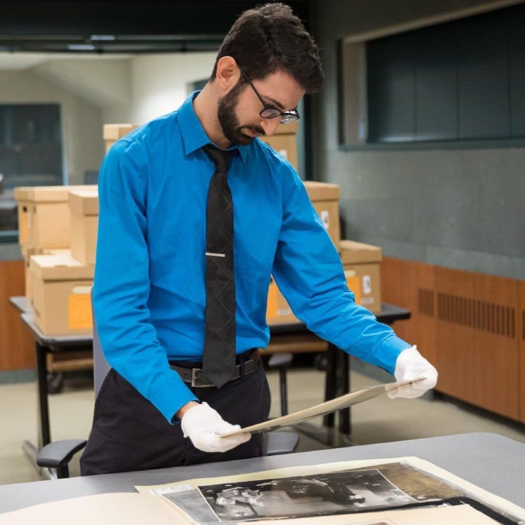 Steven Calco, interim assistant director of the Kheel Center, researches rare pamphlets addressing the more than 100-year-old fight for a fair minimum wage.