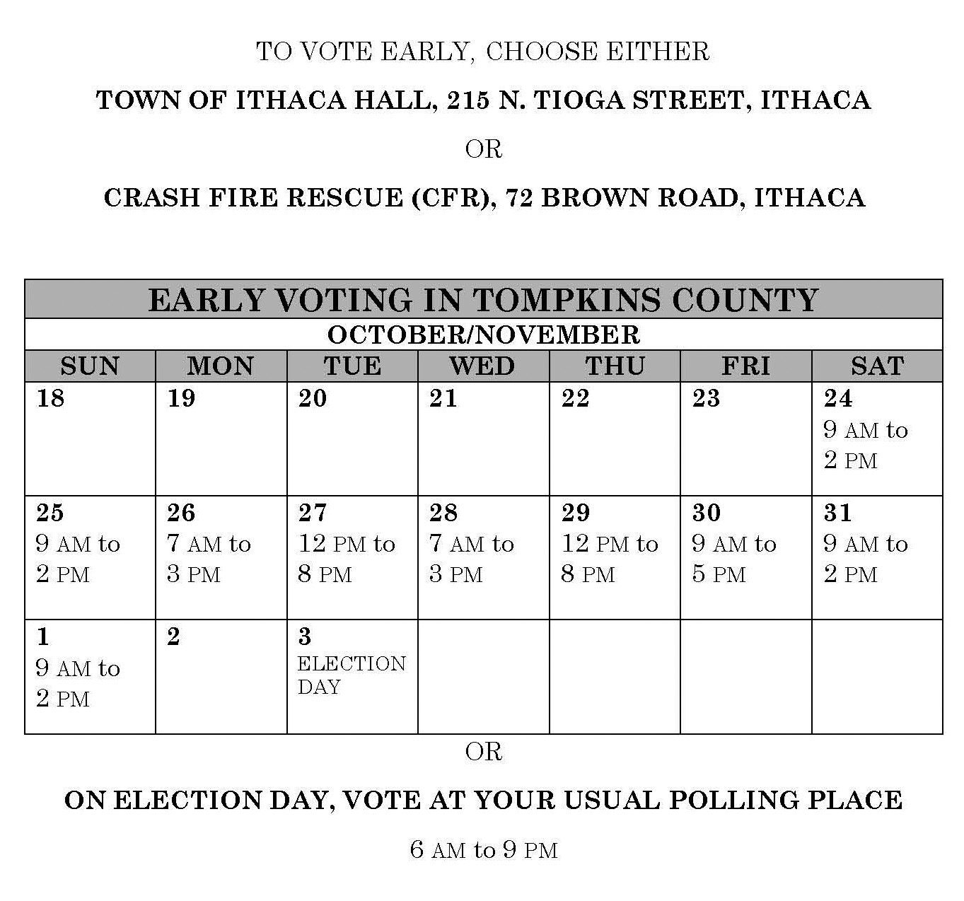 Early voting is easy, safe and ensures that your vote will be counted on Election Day. No matter where you live in Tompkins County, just wear a mask and show up at either of the two early voting sites. The city will provide special parking at Ithaca Town Hall, and there is ample parking at Crash Fire and Rescue.