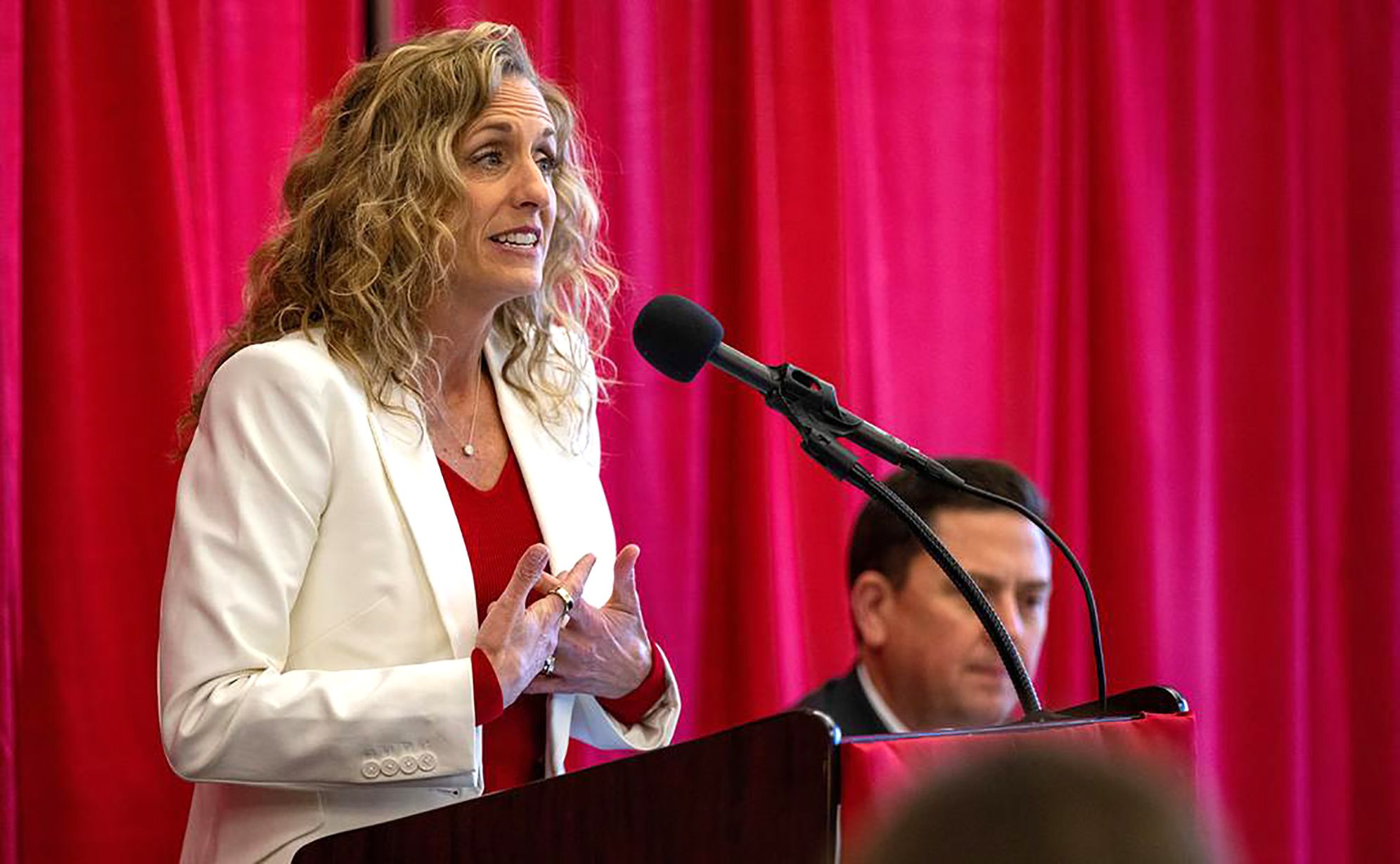 Nicki Moore, Ph.D., speaks at her public introduction Dec. 2 as Cornell University’s next director of athletics. Moore will be the first female AD in the school’s history. Photo by Eldon Lindsay/Cornell Athletics.