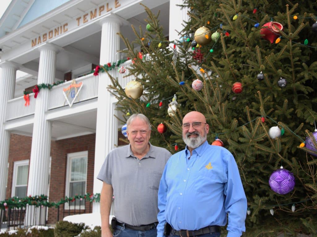 Newfield Masonic Lodge Treasurer Michael McLaughlin, left, and Trustee Steve Yaple outside of the Masonic Temple on Main Street on Dec. 10. As one of Newfield’s oldest institutions, the Masons have supported major town events for decades with funding and a commitment to community service.
