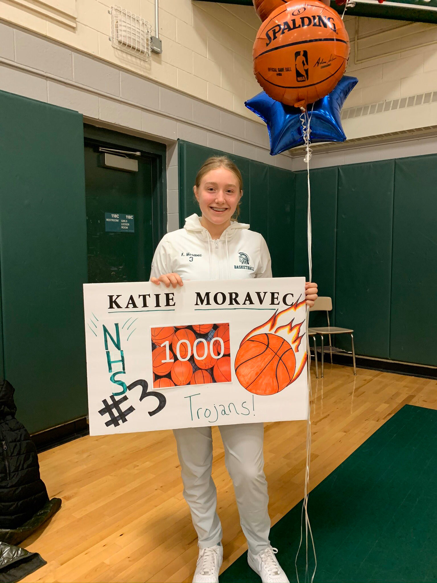 “I didn’t know and I wasn’t really thinking about it,” Moravec said. “My coach knew, and he told the fans and everything before the game. They had a bunch of posters and balloons and things made for me. He set up a play, and I made a three, and I only had three left to get to 1,000 at that point. Everyone stopped and cheered, and I got hugs from family.”