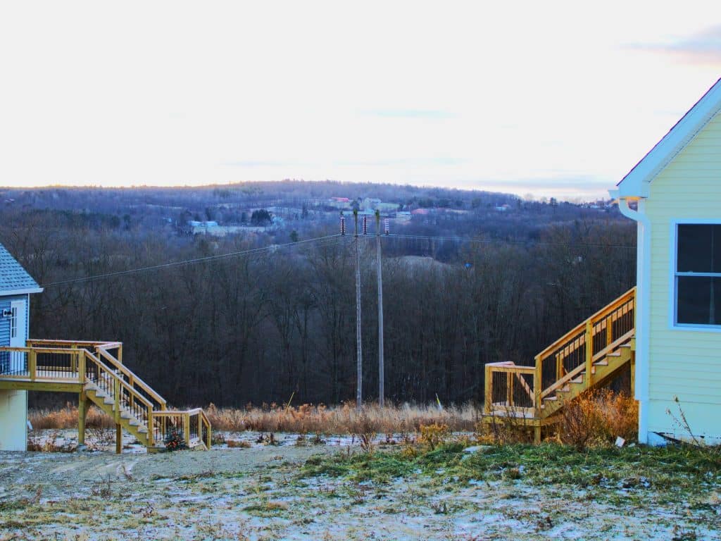 Kirsten Hamberg’s two chalets on Douglas Road in Newfield, which overlook power poles in her backyard. Hamberg, who moved to Newfield at the end of 2024, is one of over a dozen homeowners in the town whose property will be impacted by New York State Electric and Gas’ (NYSEG) ongoing Finger Lakes Area Infrastructure Reliability project.