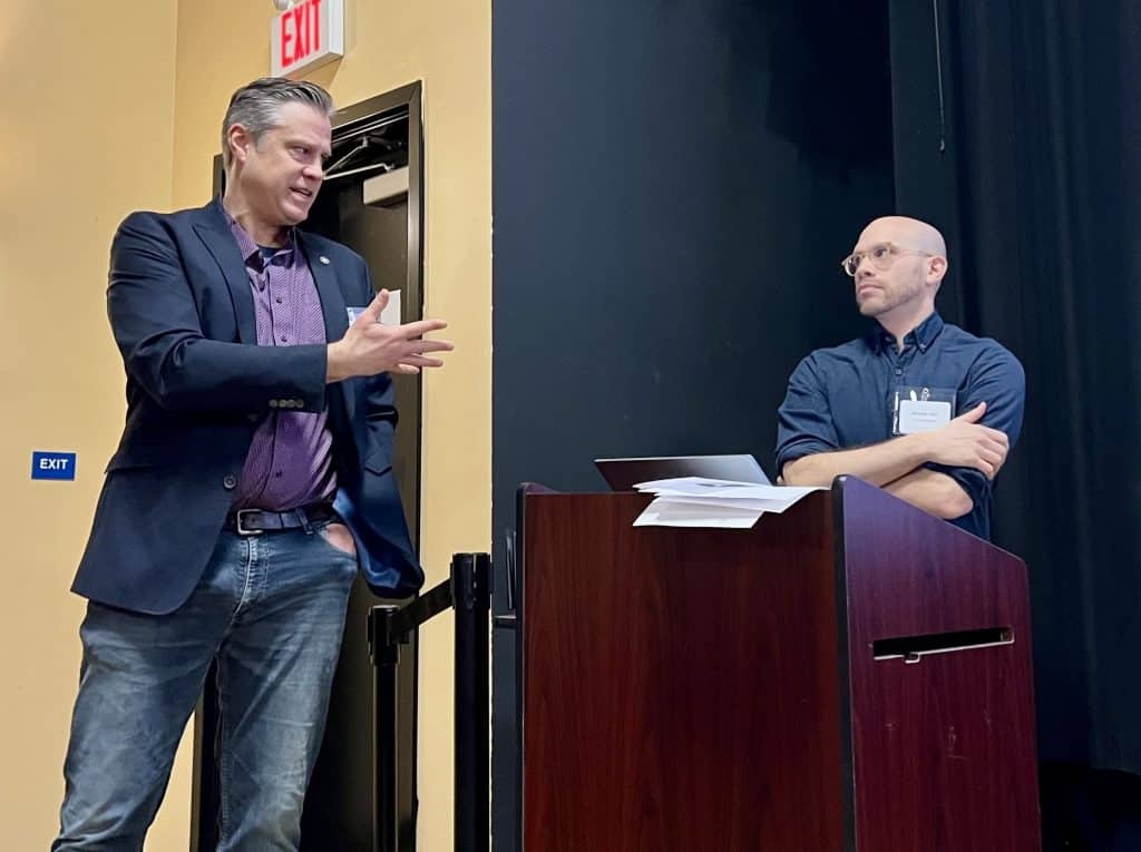 Tom Knipe (left), deputy director of economic development for the city of Ithaca, gives a presentation with Nicholas J. Klein at the 2025 Economic Summit on March 6, hosted at Cinemapolis by Ithaca Area Economic Development and the Tompkins Chamber.
