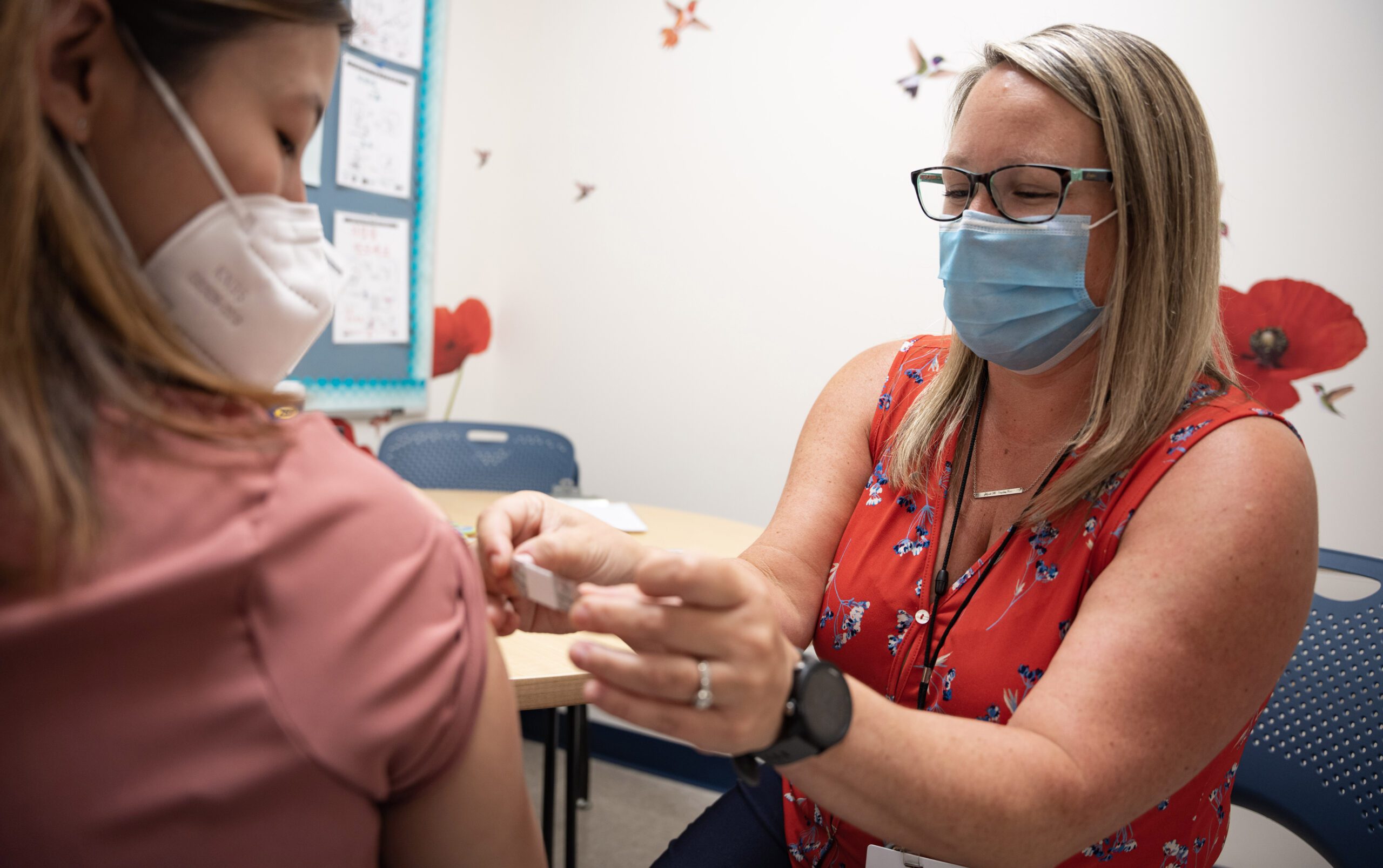 At the Tompkins County Health Department Immunization Clinic, Community Health Nurse Jessica Clark Manderville vaccinates someone. Due to an increase in respiratory illnesses in the region, the Health Department is recommending that all who are able get fully vaccinated against COVID-19 and the flu. Photo by Shira Evergreen.