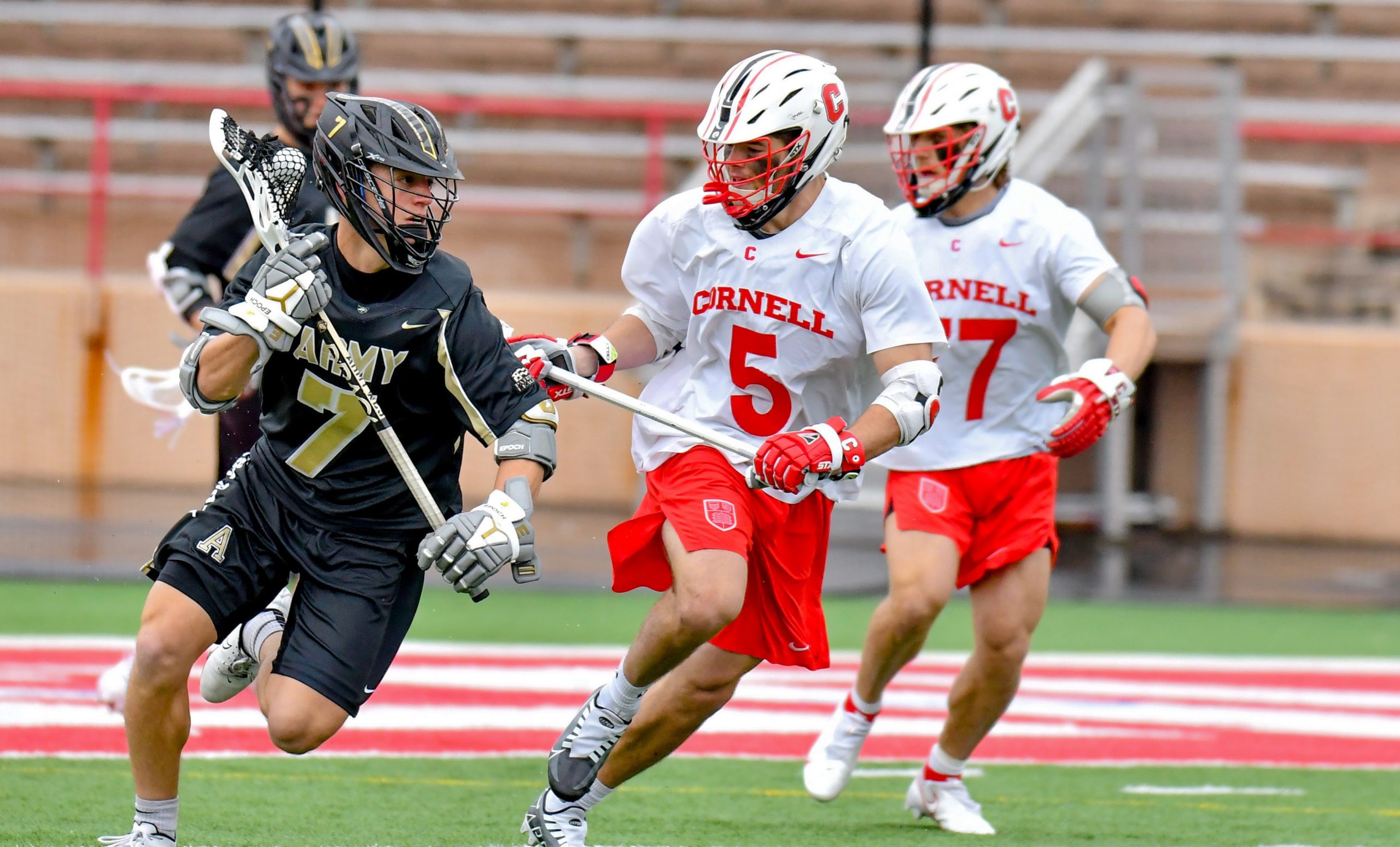 Ithaca High School alum Ryan Sposito (left) runs around Cornell University midfielder Michael Bozzi. Sposito, a junior at Army West Point, scored three goals in a win at Cornell after having one career goal prior. Photo by Army West Point Athletics.