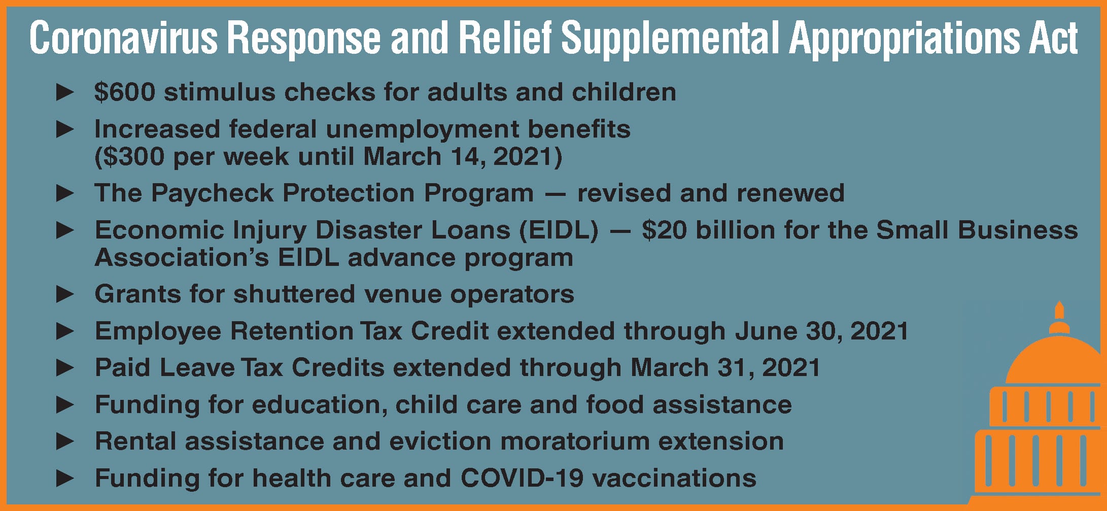 The Coronavirus Relief Act includes $600 stimulus checks for adults and children, increased federal unemployment benefits, revision and renewal of the Paycheck Protection Program, $20 billion for the Small Business Association’s Economic Injury Disaster Loans advance program, grants for shuttered venue operators (Save Our Stages Act), extensions on Employee Retention Tax Credit and Paid Leave Tax Credits, rental assistance and an eviction moratorium extension.