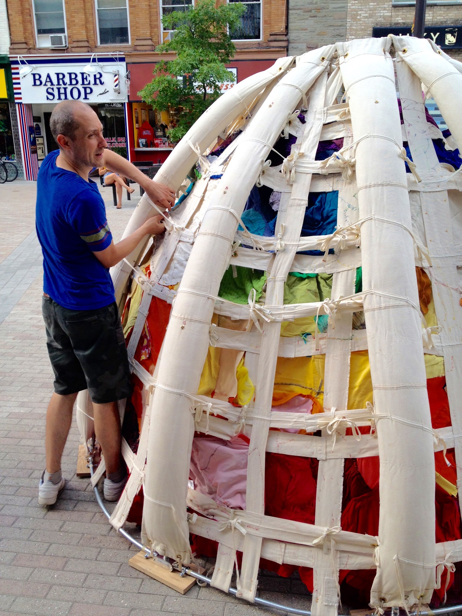 Sustainable Tompkins recently hosted Brooklyn-based artist James Leonard on the Ithaca Commons with his Tent of Casually Observed Phenologies. James has created a performance installation that is not complete until someone from the community joins him inside the tent to talk about their own climate future. The circular tent is a neutral muslin on the outside, but a rainbow of colors inside where bits of recycled clothing have been sewn together to create a ritualistic space for contemplating one’s own relationship with the planet’s warming. On the outside of the tent, small paintings of familiar plant and animal species affected by climate change are pinned.
