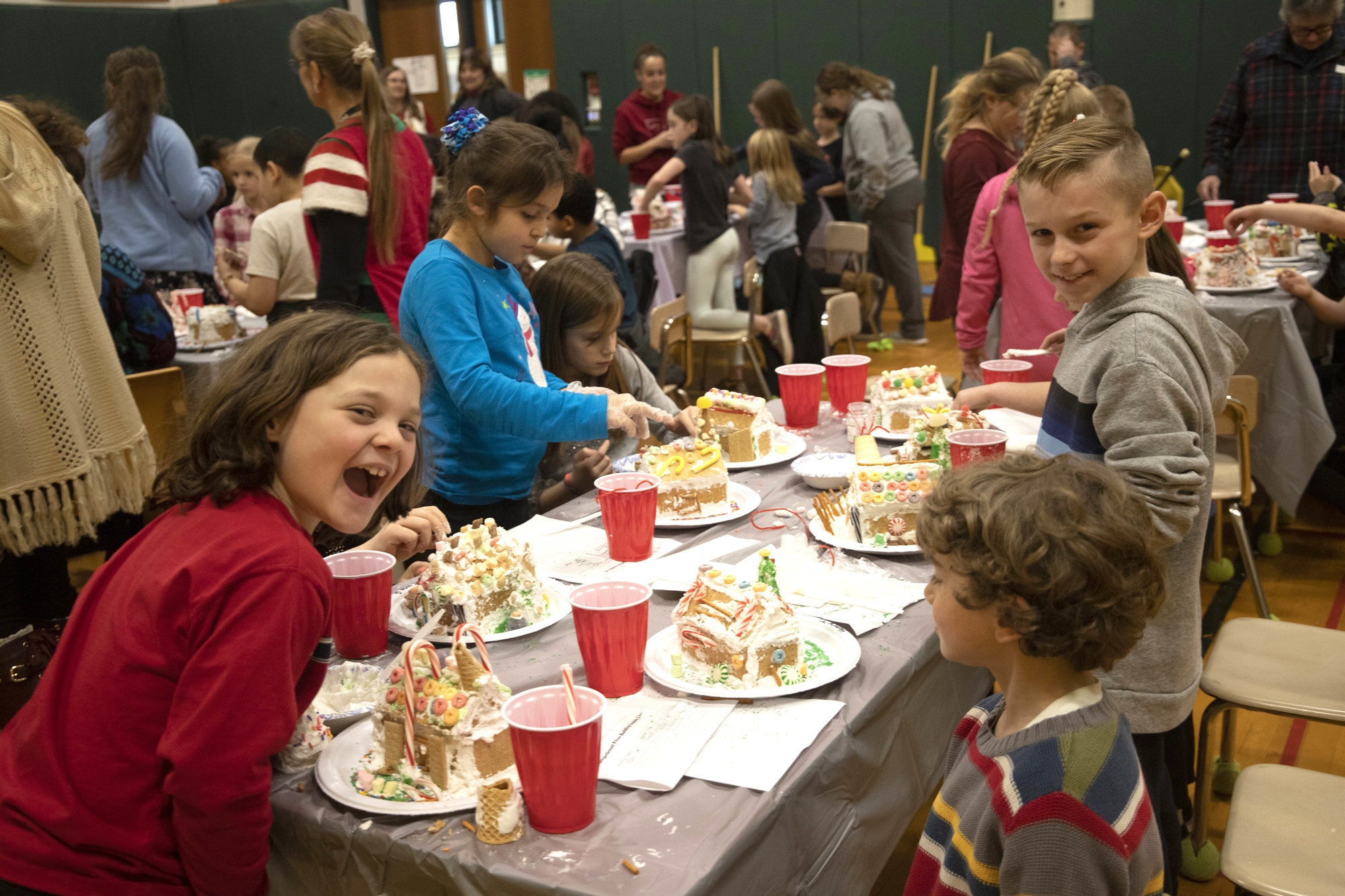 Armed with items from home, such as gum drops, candy canes, mini marshmallows, sprinkles, a box of colorful cereal and graham crackers, all third-graders (about 60 students) recently gathered together in the school’s upper gymnasium to construct and decorate gingerbread houses.
