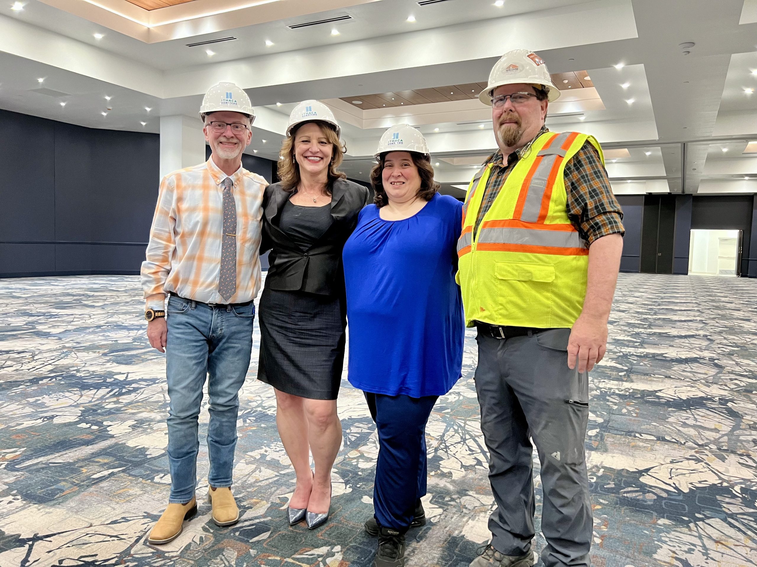 With its expanse of dark blue walls and rows upon rows of recessed lighting in white and wood-toned ceilings, one could imagine events of every kind coming to life when entering the 10,600-square-foot ballroom on the second floor of the new Ithaca Downtown Conference Center.