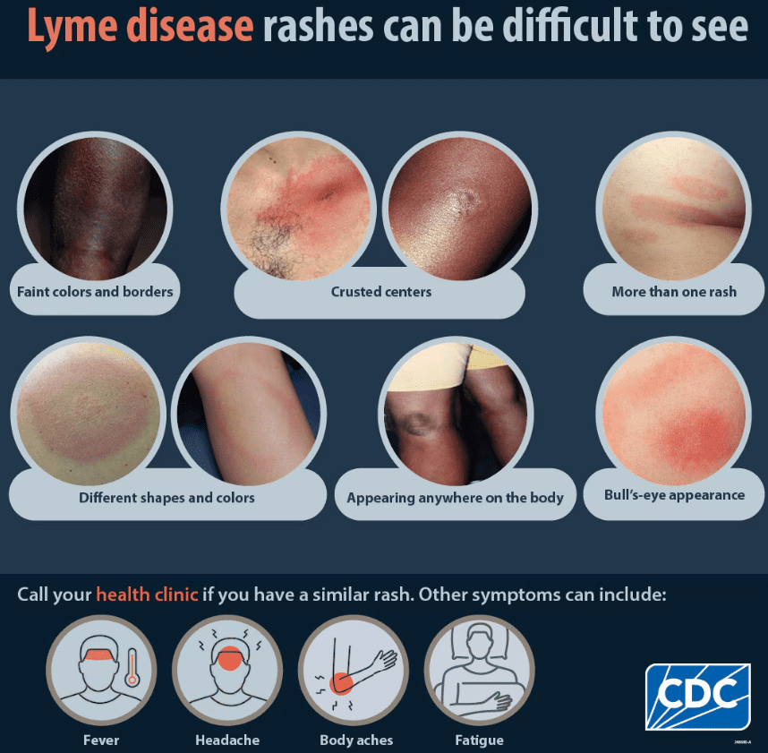 An often-publicized sign of Lyme disease is a “bullseye” rash (a red circle with a red ring around it), but rashes associated with Lyme disease come in all different shapes and sizes, Klepack said.