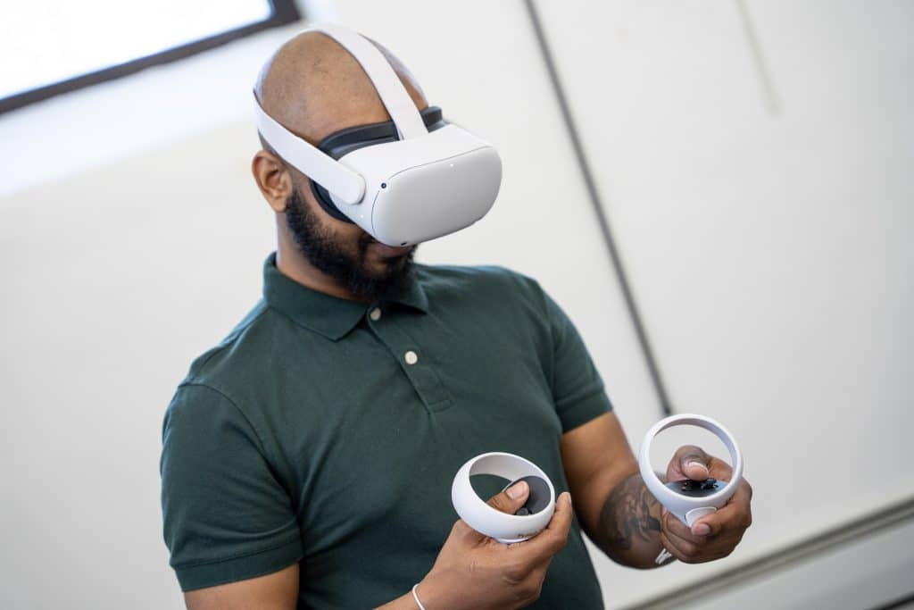 Demetrius Cox uses a virtual reality headset during his training in the Direct to Work program.
