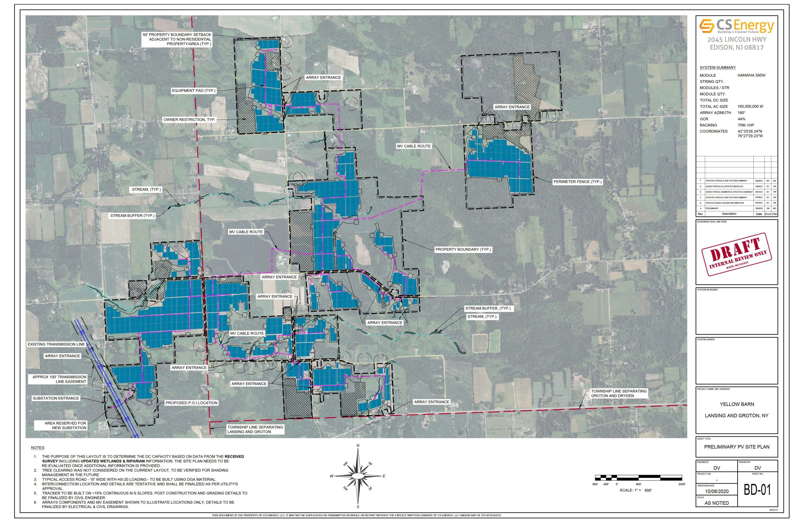 Yellow Barn Solar, currently managed by CS Energy, is a planned “160 MW-ac solar power generation project, located on approximately 1,100 acres across the towns of Groton and Lansing,” according to the project’s website (yellowbarn-solar.com).