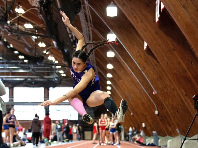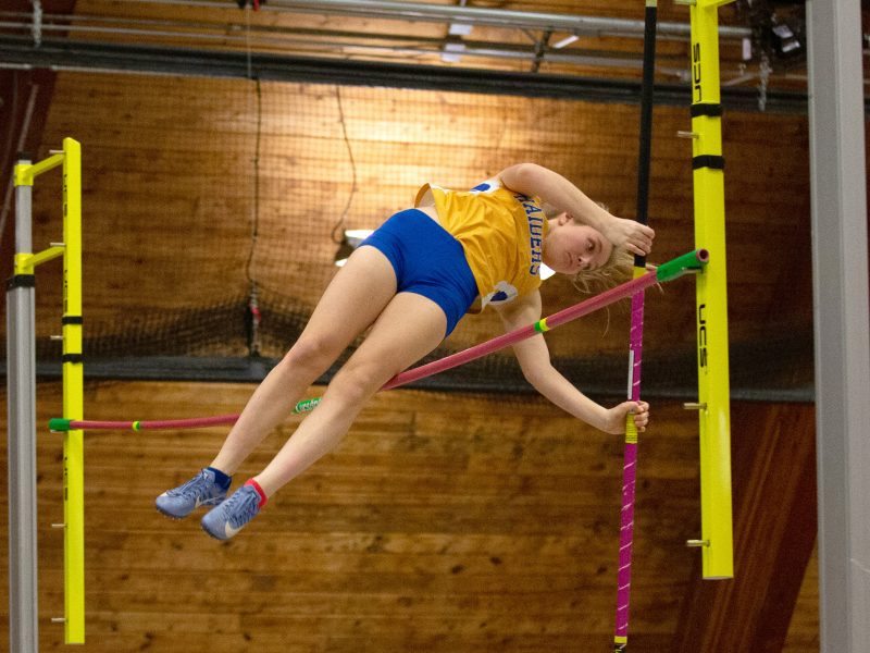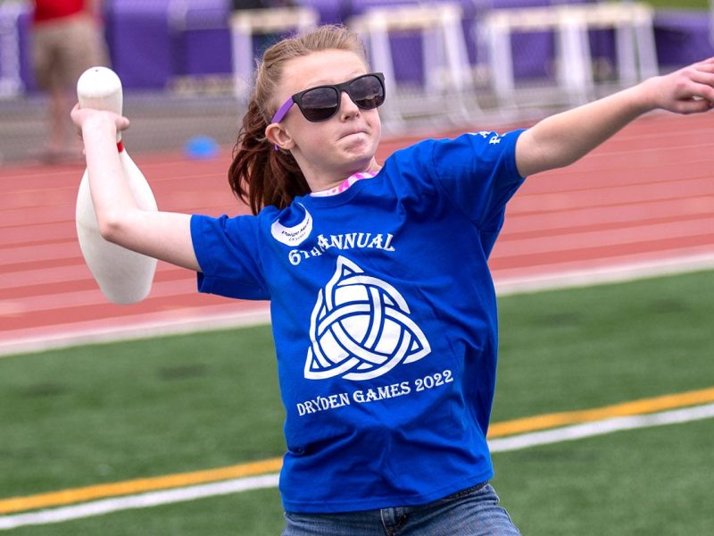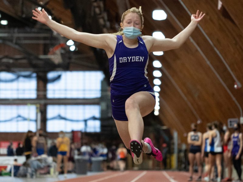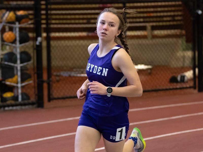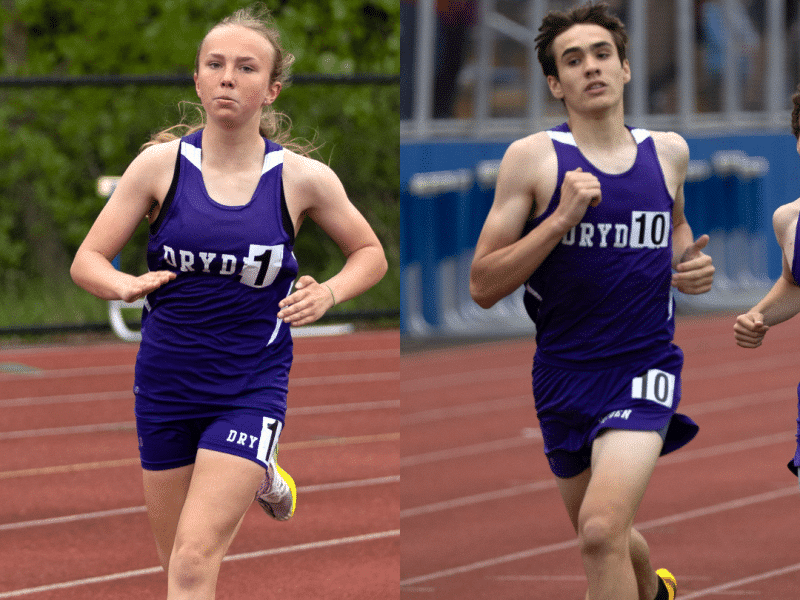 Dryden’s track team excels with girls’ IAC runner-up finish & state appearances by Reagan Burnham & Paul Busby, coached by retiring Karen Weaver.