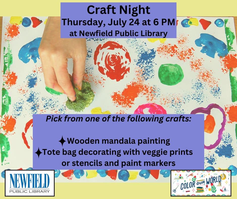 Newfield Public Library 198 Main St, Newfield, NYJoin us at the Library for a family-friendly craft night! We will have a few options to choose from including tote bag decorating with veggie prints or stencils and paint markers, or pre-made wooden mandala painting.