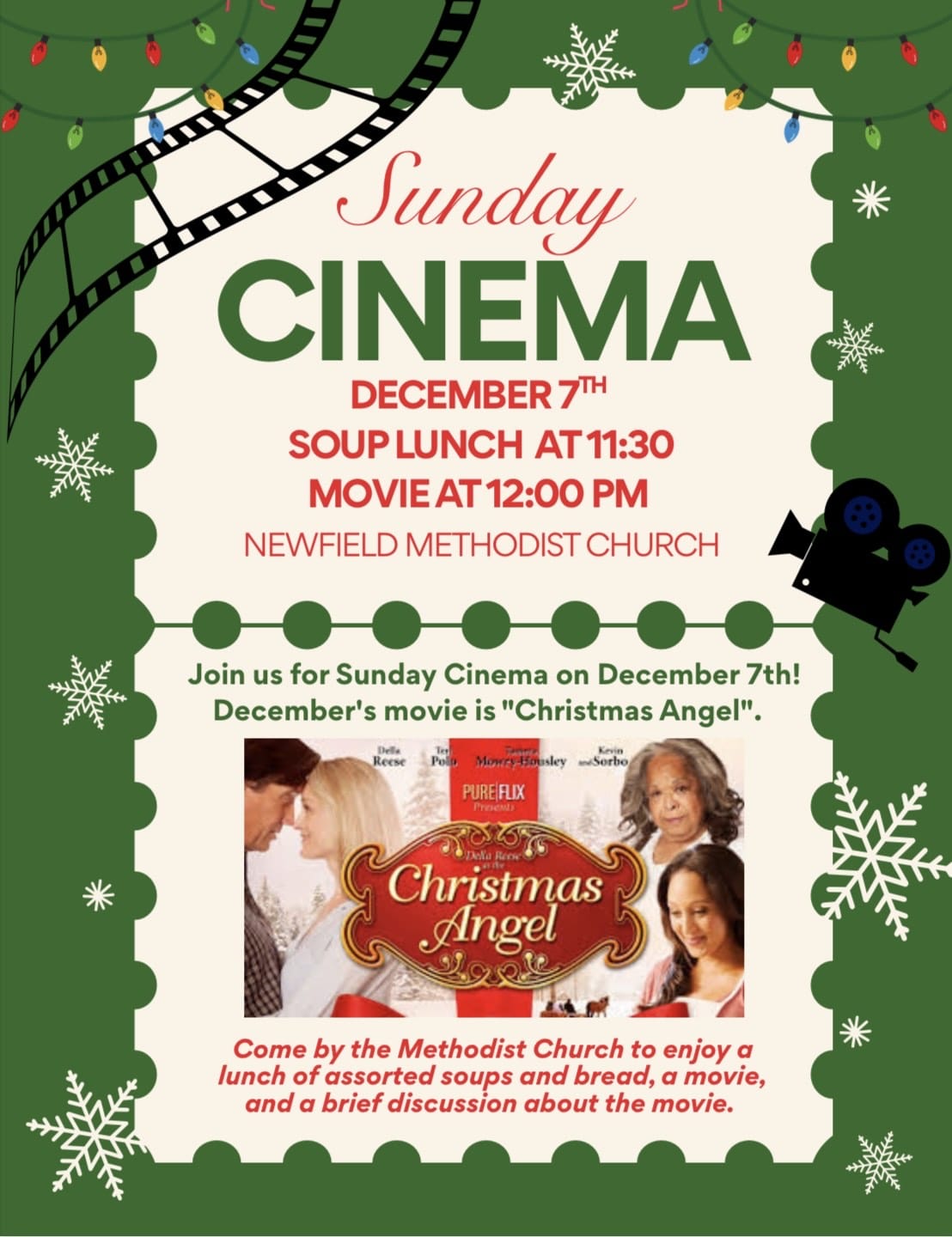 Join us for Sunday Cinema at Newfield United Methodist Church on December 7th. Enjoy a lunch of assorted soups and bread at 11:30 and the movie “Christmas Angel” at noon followed by a brief discussion about the movie.