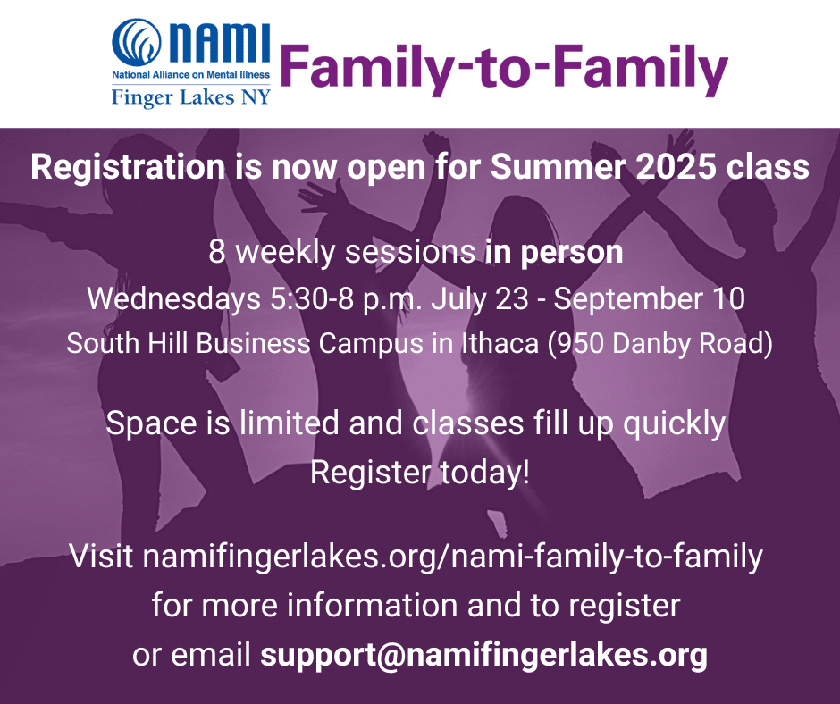Registration is now open for the Summer 2025 Family-to-Family class at NAMI Finger Lakes. Visit https://www.namifingerlakes.org/nami-family-to-family for more information and to register. This 8-week class will meet in person each Wednesday 5:30-8 p.m. from July 23 through September 10 at the South Hill Business Campus (950 Danby Road) in Ithaca. The class is free and […]